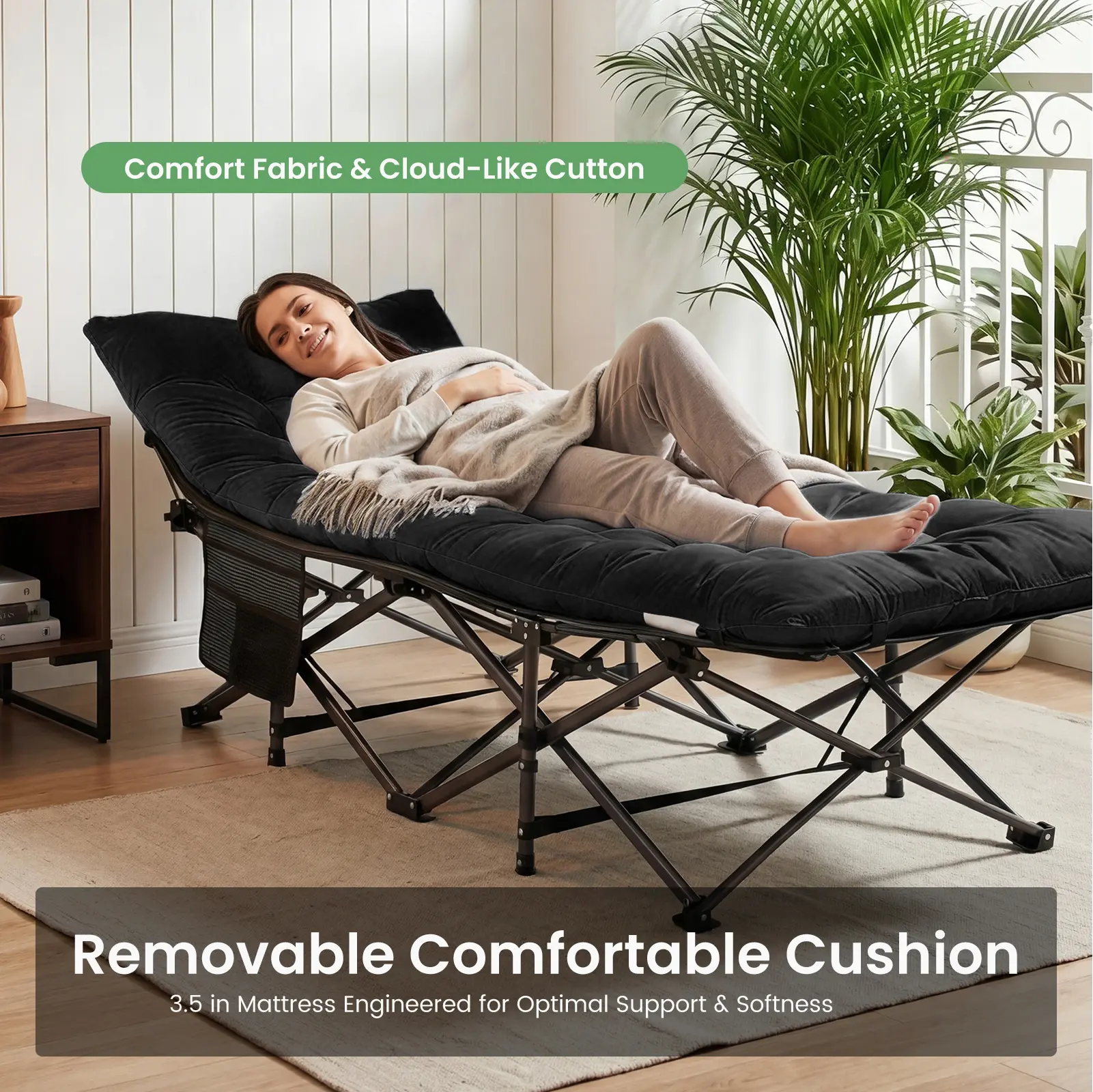 ·【Comfortable Mattress】The portable folding camping cot comes with a soft mattress pad, which enhances comfort, allowing you to sleep more comfortably on this portable folding camping bed. In summer, the camping pad can also be removed to improve breathability.