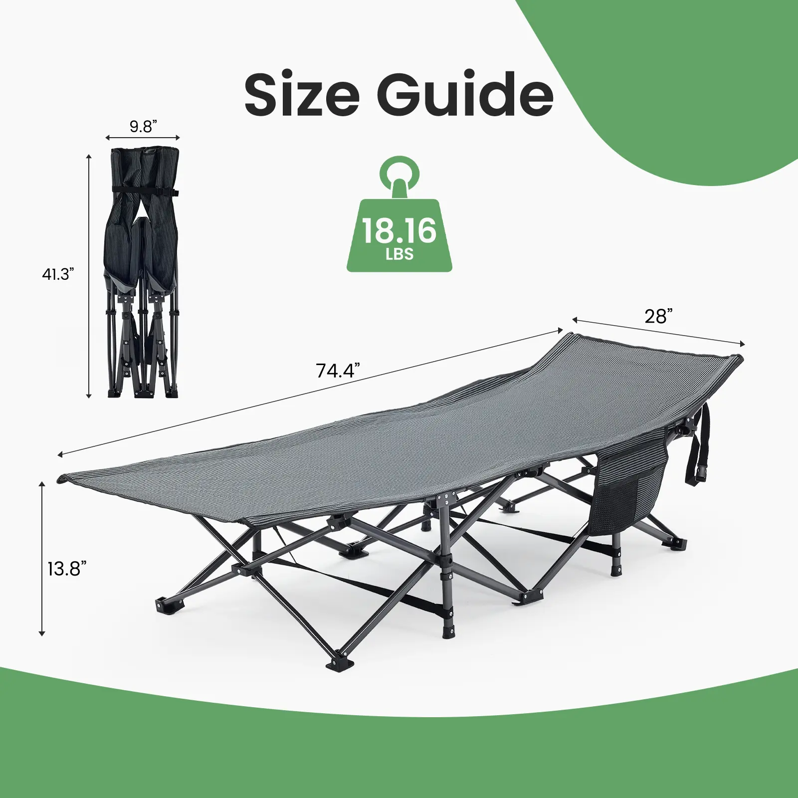 Our folding camping cot for adults will ensure you can relax on your camping trip with its user-friendly setup and portability. The comfortable cots for adults are designed to be extra wide and long to accommodate a range of camping enthusiasts. he camping tent cot bed provides an easy-to use portable sleep solution for camping trips, days at the beach, and lounging under the stars.