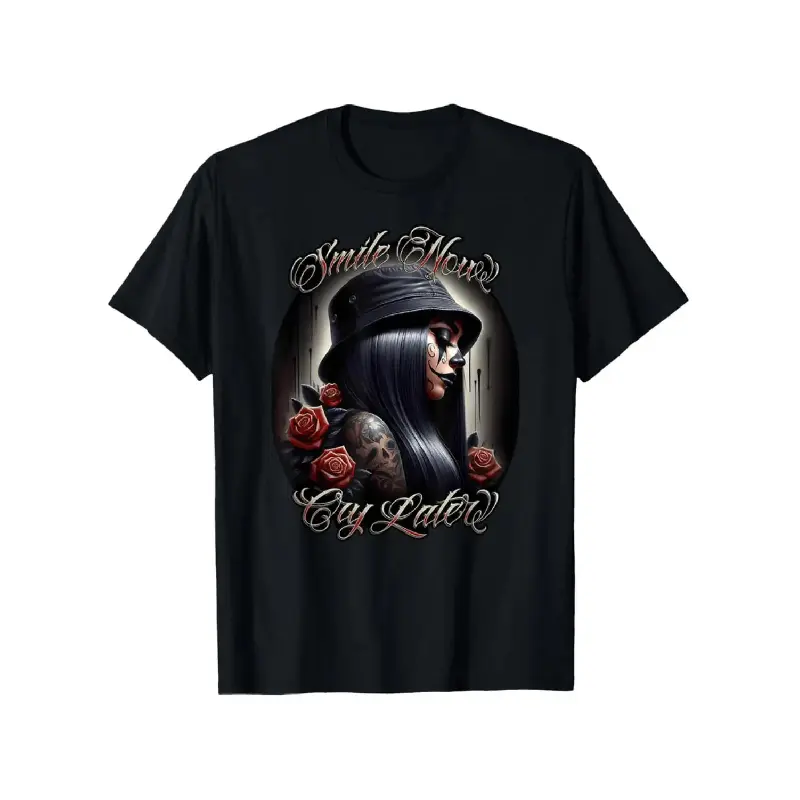 Chicana Payasa Tattoo Art Cotton T-Shirt With Smile Now Cry Later Design