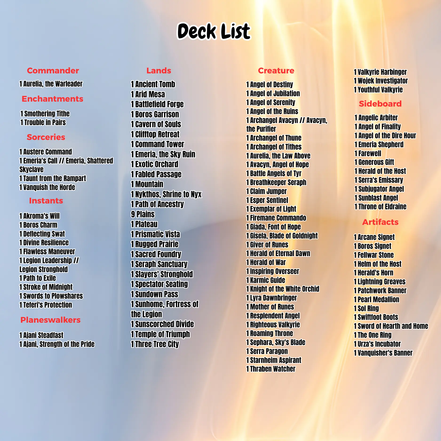 Lead a heavenly legion into endless battle with Aurelia, the Warleader, a Commander deck built around extra combat phases, angelic power, and overwhelming aggression. This MTG Proxy deck (100 Cards + Tokens) is reimagined with a radiant celestial aesthetic — blazing wings, golden armor, divine light, and apocalyptic skies filled with descending angels. Every card shines with holy fire and unstoppable momentum.