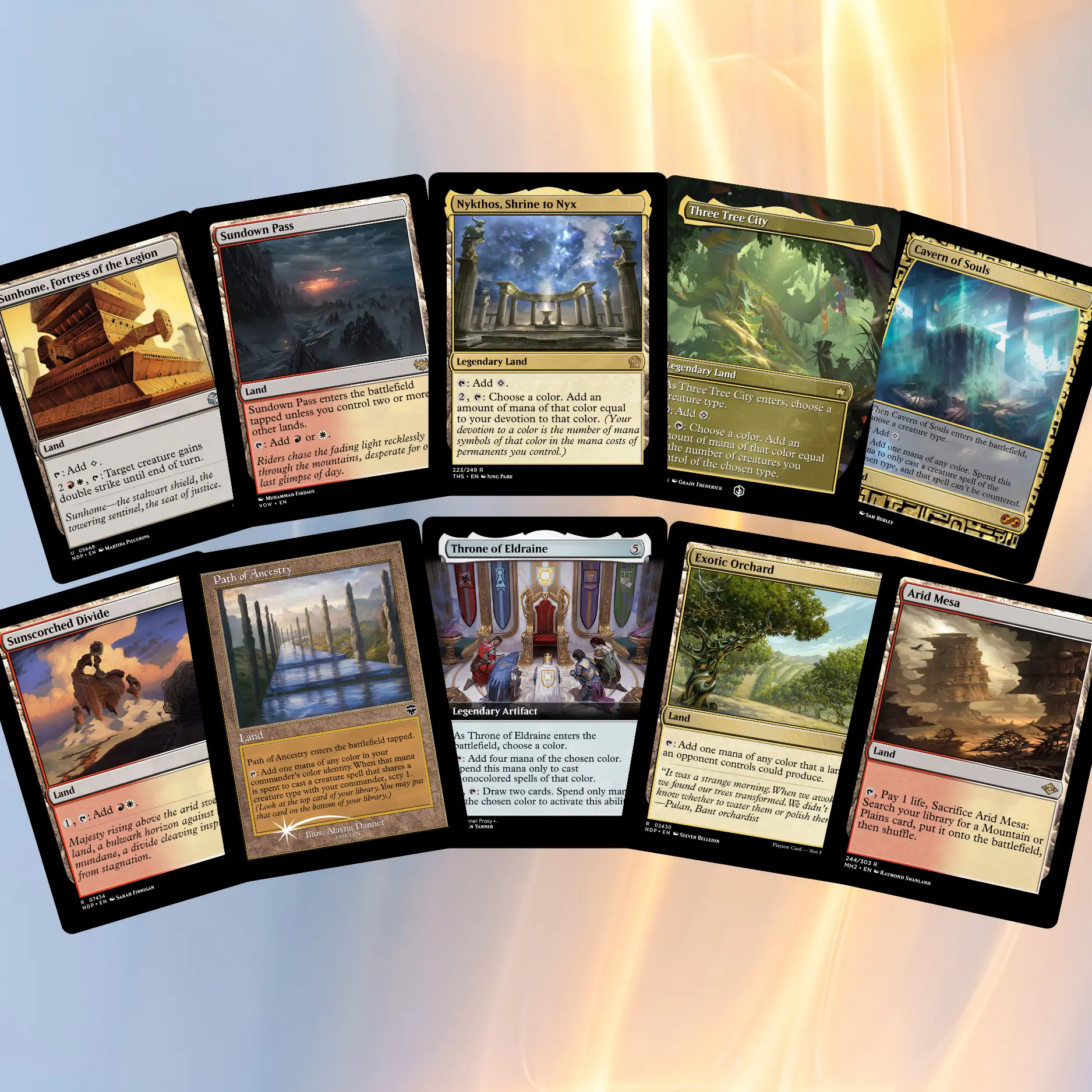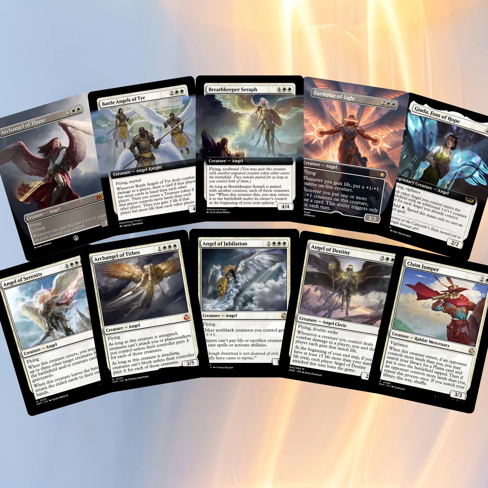 Angels, divine light, burning skies, and heavenly battlefields across all cards.