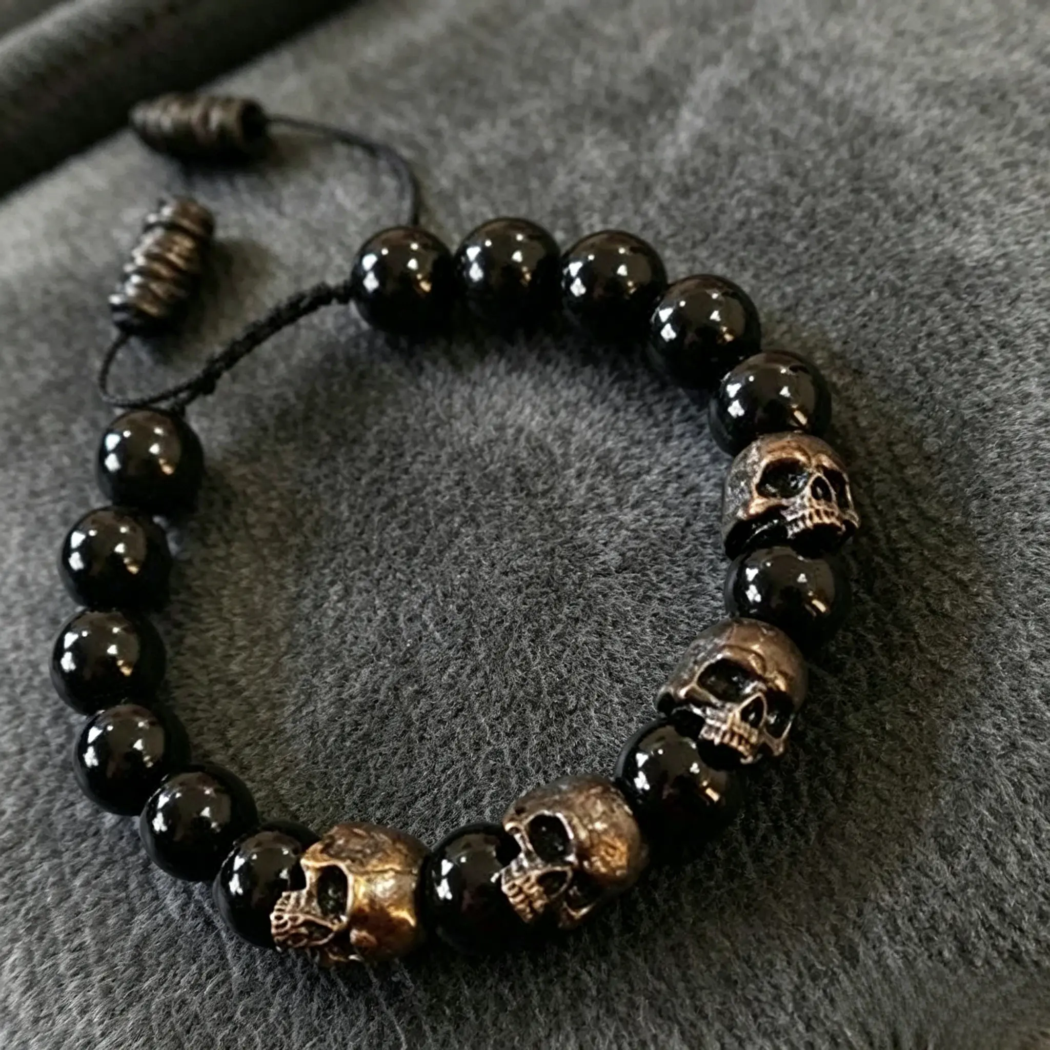 Antique Bronze Skull Accents: Interspersed with intricately detailed antique bronze-tone skull beads, adding a dramatic, gothic statement that embodies rebellion, strength, and timeless edge.The vintage metal finish contrasts beautifully with the smooth black stone.