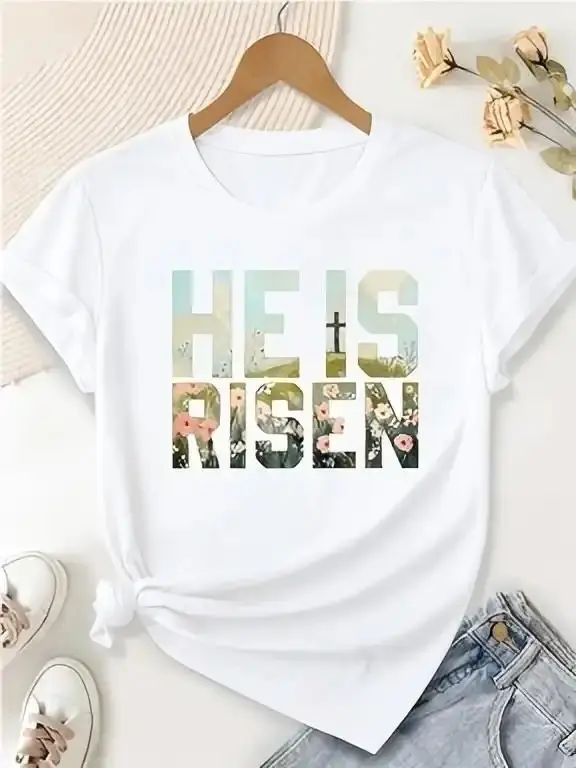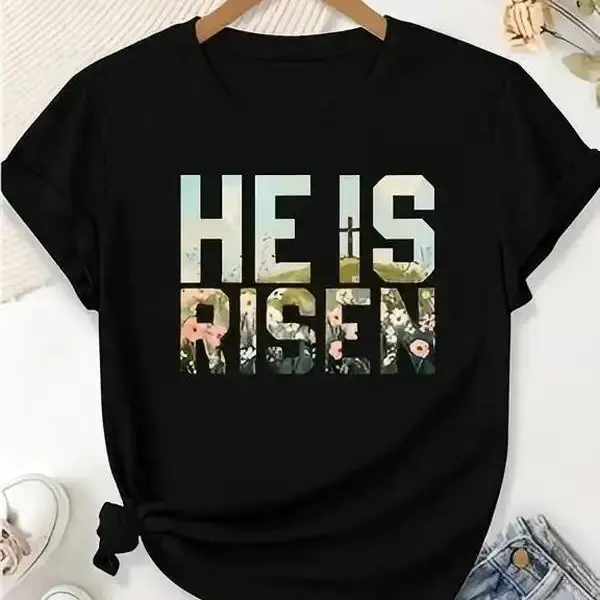 Easter Elegant Party Women's HE IS RISEN Graphic Print Crew Neck Short Sleeve T-Shirt, Fashionable Girly Style Top for Spring, Summer, and Fall Photoshoots