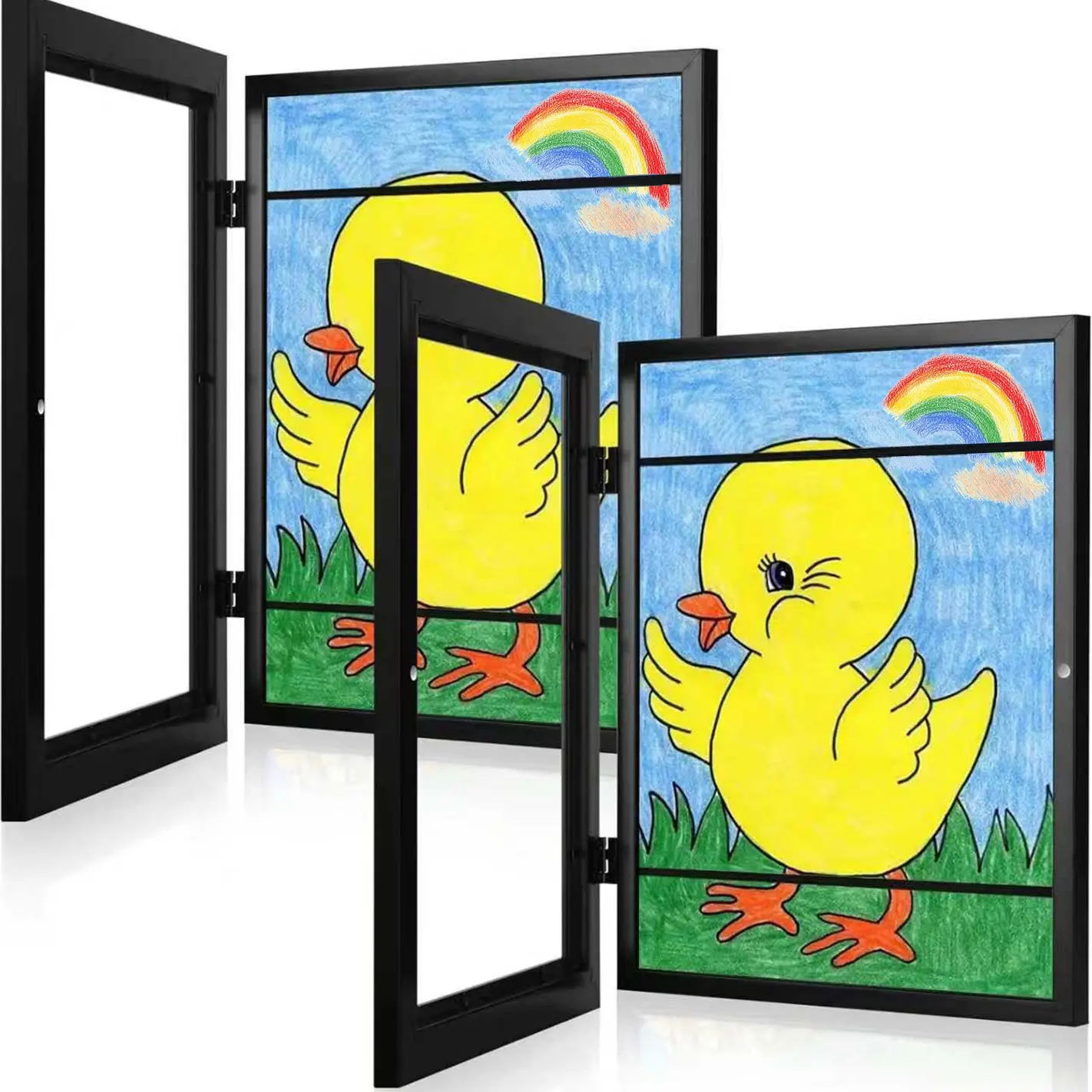 [Designed With Heart] Take art display to the next level with the 180º open design kids art frame. This design opens and closes easily and conveniently with an elastic band that allows you to display artwork or store old artwork. This best of both worlds approach displays and stores your child's artistic masterpieces in the best way possible.