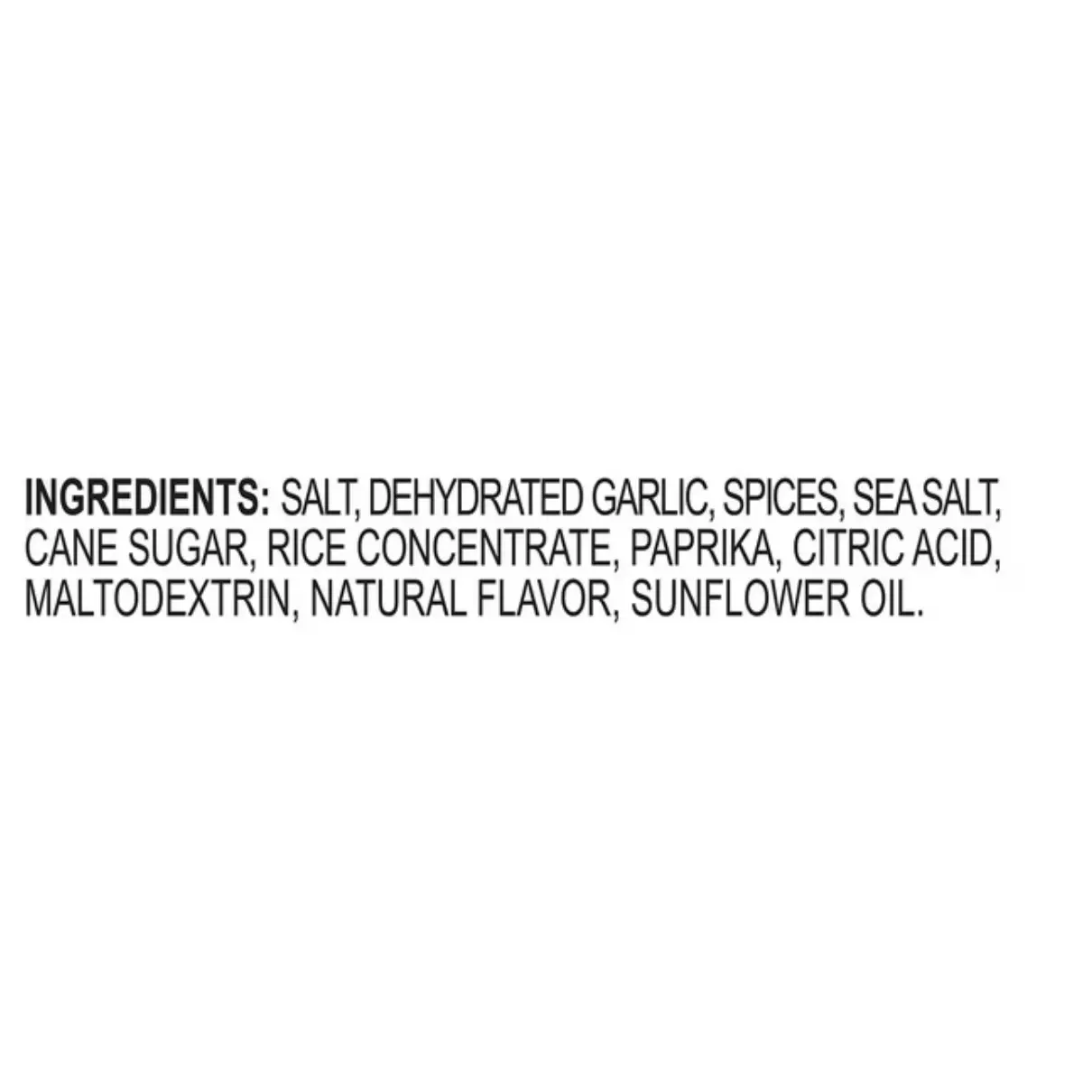 Ingredients: salt, dehydrated garlic, spices, sea salt, cane sugar, rice concentrate, paprika, citric acid, maltodextrin, natural flavor, sunflower oil.