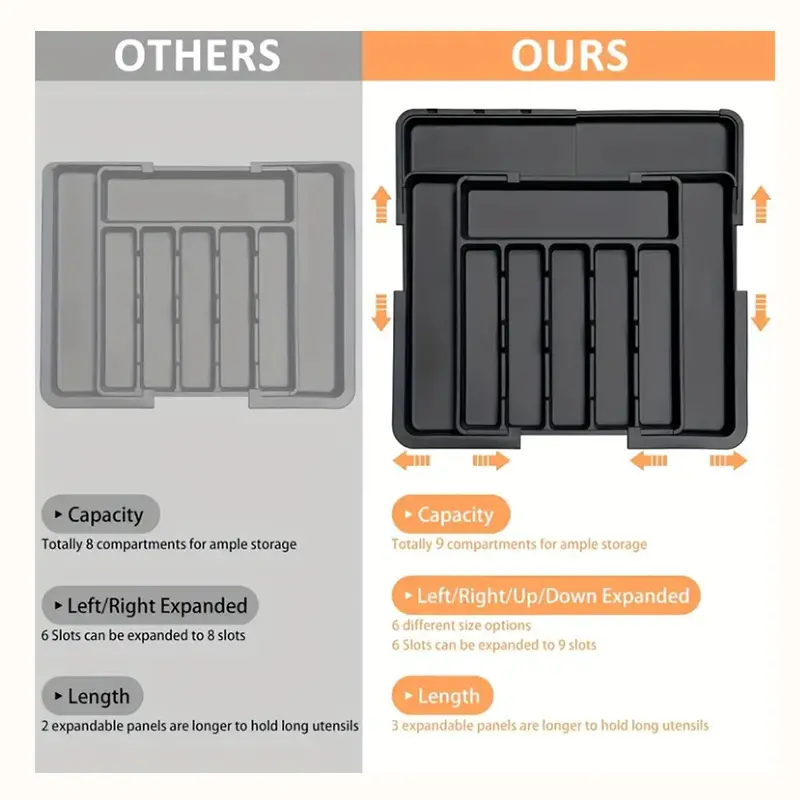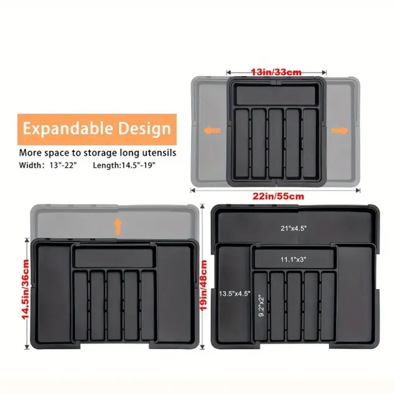 The buckle design allows smooth sliding and easy adjustment. Curved grooves ensure convenient access to utensils. Non-slip feet keep the tray in place after adjustment. Your silverware and kitchen utensils stay organized and separate.