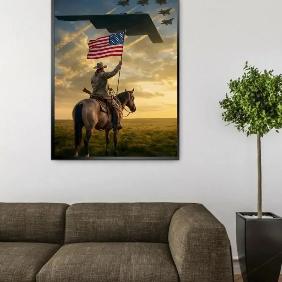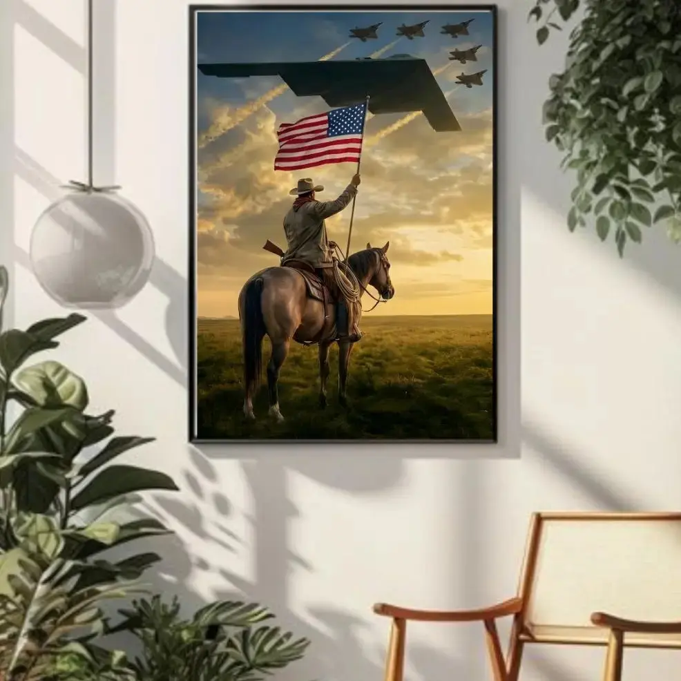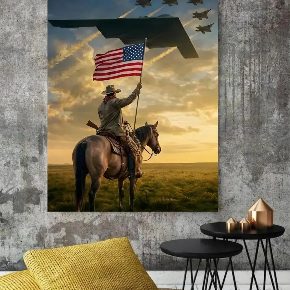 Cowboy B2 Poster Unframe, 4th of July Wall Art, Stealth Bomber Patriotic Poster, American Flag Vintage Military Decor, Independence Day Art Print