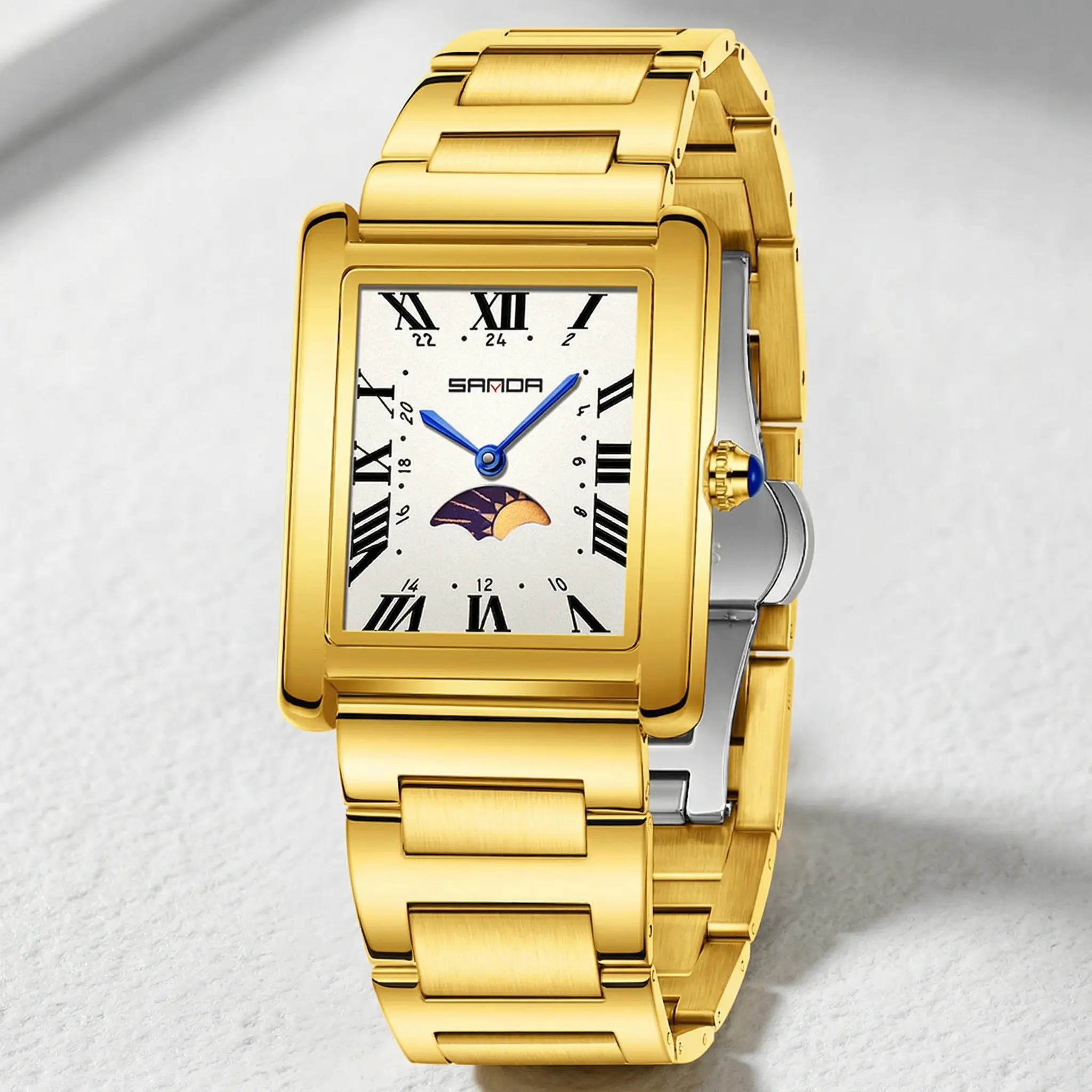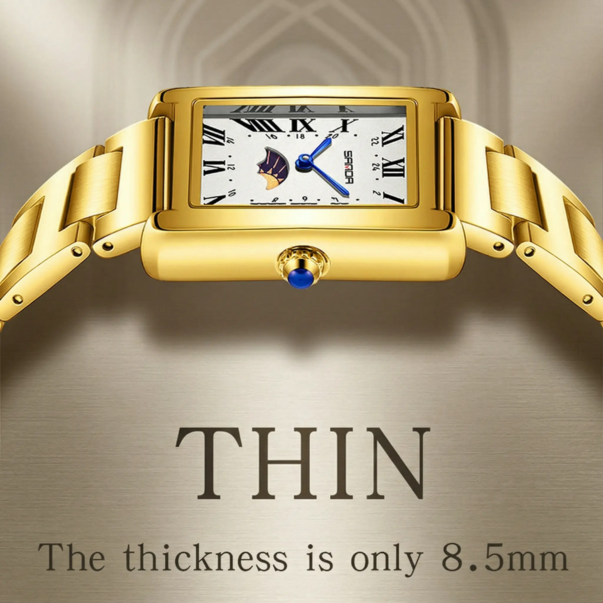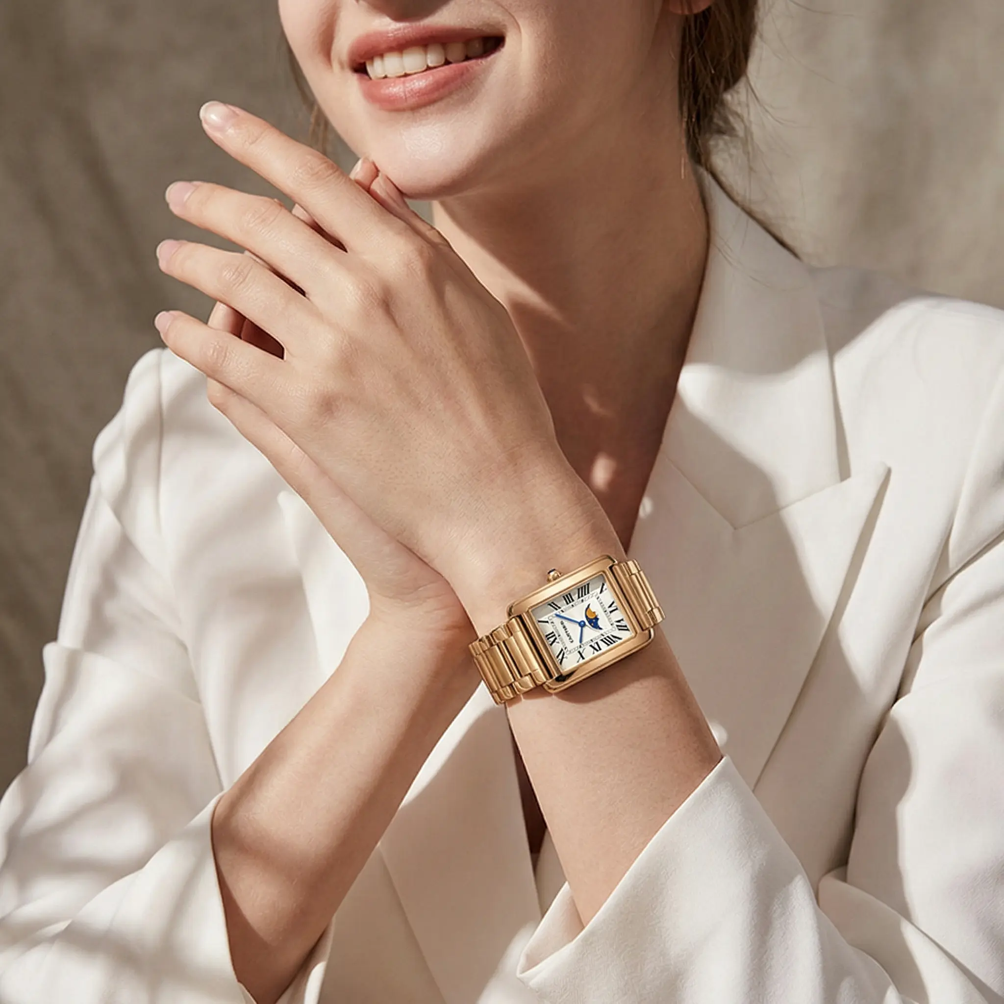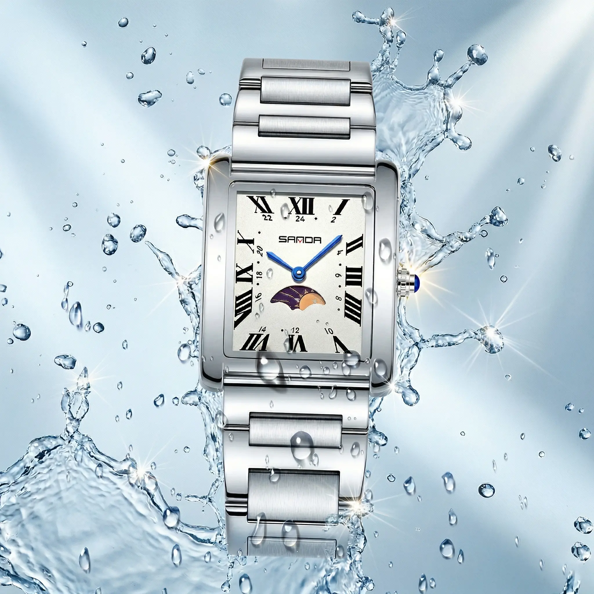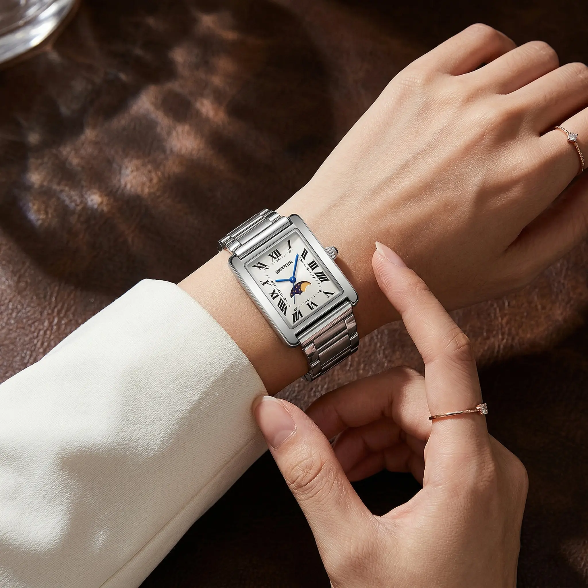 Old Money Aesthetic Square Watch for Women Elegant Vintage Moon Phase Wristwatch Stainless Steel Band