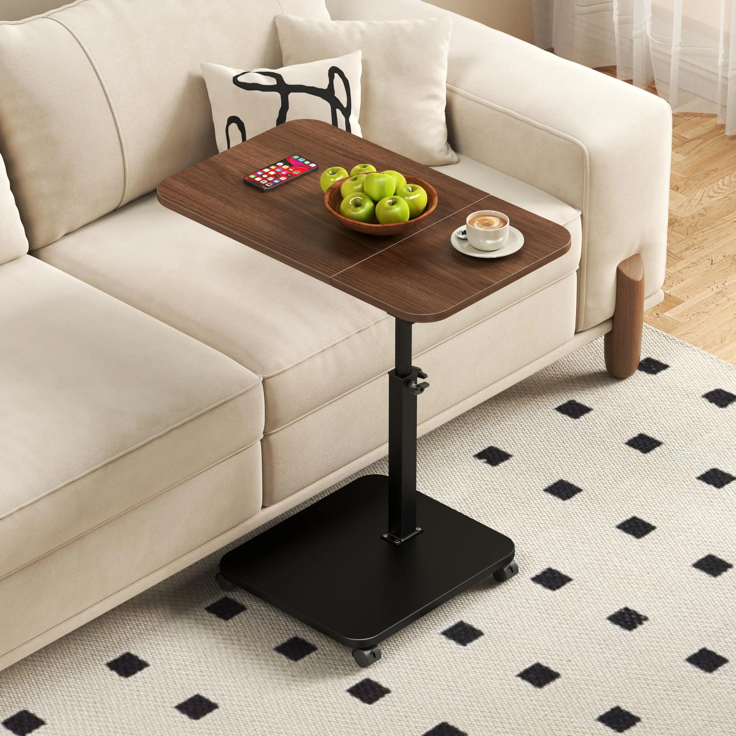 ·【Lockable universal Wheel Side Table】 Discover the convenience with our wheeled side table! Perfectly designed to slide under your couch, it maximizes space while providing easy access to drinks, coffee, snacks, or books. Its mobility allows you to effortlessly move it from room to room, making it a great addition for any occasion. Plus, just roll it aside!