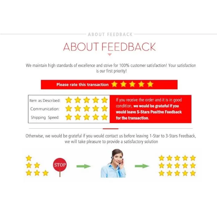 ABOUT FEEDBACK We maintain high standards of excellence and strive for 100% customer satisfaction! Your satisfaction is our first priority! Please rate this transaction tem as Described: Communication : Shippig Speed: if you receive the order and it is in good condition, we would be grateful if you would leave 5-Stars Posltive Feedback for the transaction Otherwise, we would be grateful if you would contact us before leaving 1-5 stars Feedback, we will take pleasure to provide a satisfactory solution
