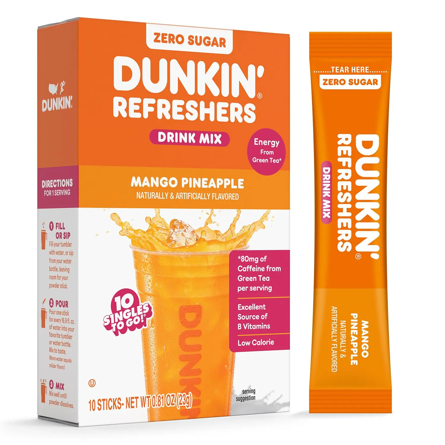 ·Each box comes with 40 individual drink mix sticks of Dunkin Refreshers Singles To Go! drink mix, available in 4 delicious flavors. Naturally and artificially flavored drink mix. For best results, mix one stick with 16.9 FL OZ of water.