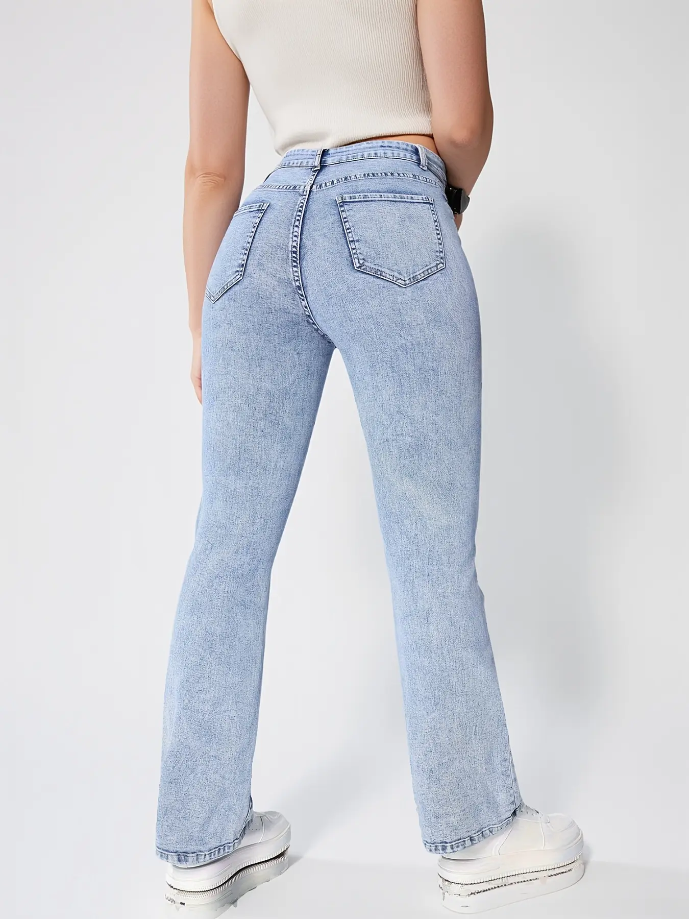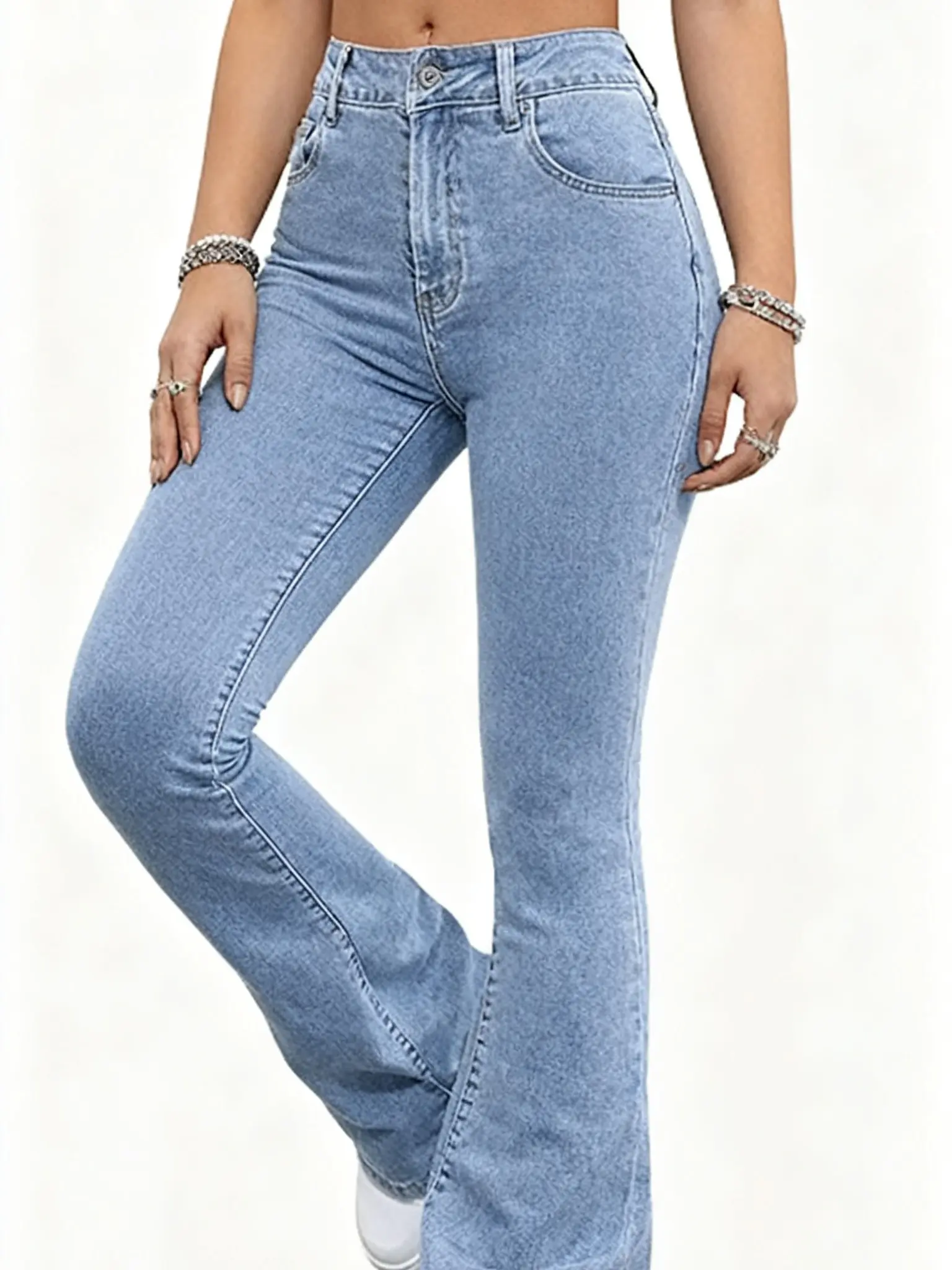 Pair them with a simple top or a blouse for a polished look. These jeans are a must-have for every fashion-forward woman. Embrace the classic charm of blue washed flare jeans and step out in style.