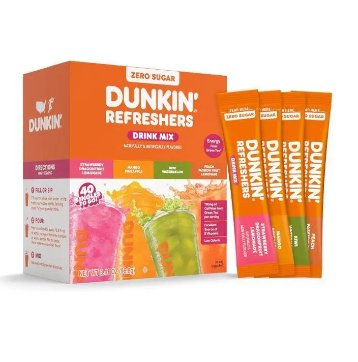 ·Each box comes with 40 individual drink mix sticks of Dunkin Refreshers Singles To Go! drink mix, available in 4 delicious flavors. Naturally and artificially flavored drink mix. For best results, mix one stick with 16.9 FL OZ of water.