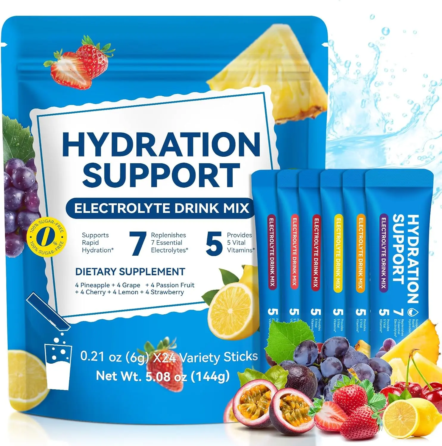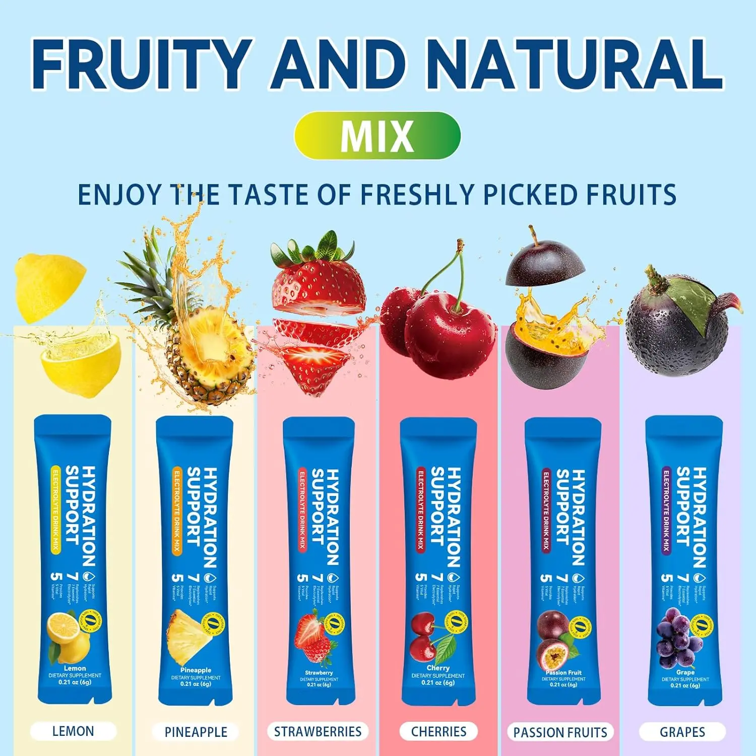 ·【Great Taste & On-the-Go Package】One package is packed with 6 mixed fruity flavors including pineapple, strawberry, grape, cherry, lemon, passion fruit, allowing you to enjoy different flavors in a week. The individual packets are incredibly convenient for travel, gym bag, or keeping at work.