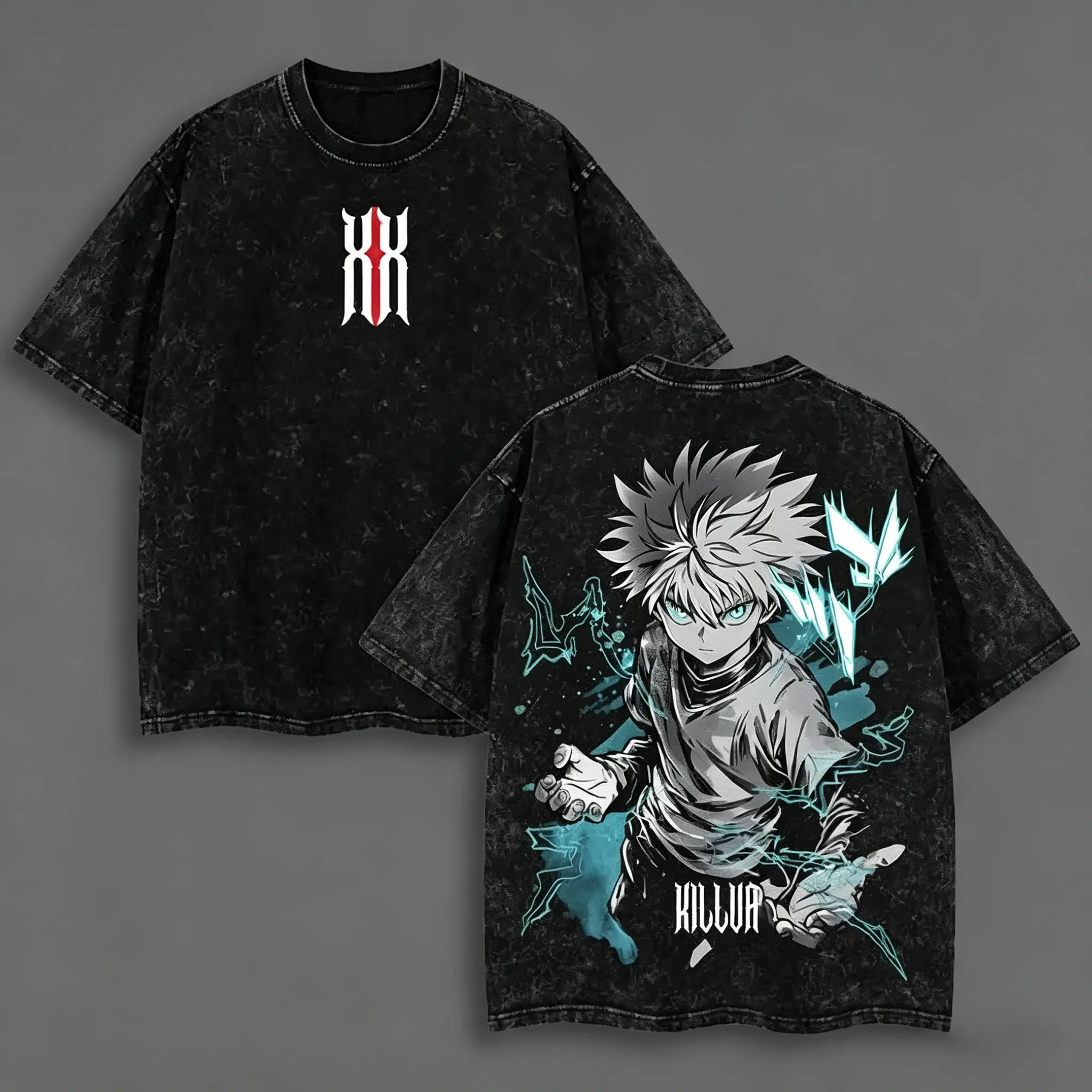 Killua Zoldyck T-Shirt Hunter x Hunter Graphic Anime Tee Acid Washed Soft Cotton Shirt Anime Streetwear Casual Menswear Unisex Summer Clothing Gift for Anime Fans