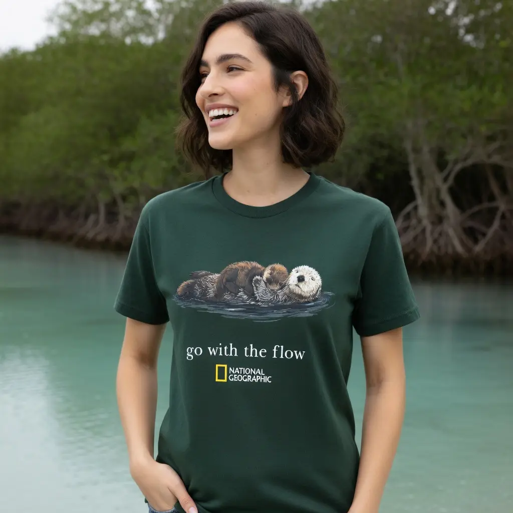 This adorable and calming t-shirt features a charming otter floating peacefully on water, paired with the uplifting phrase “go with the flow.” Set on a soft neutral backdrop, the detailed wildlife illustration brings a serene, nature-inspired vibe, making it perfect for anyone who loves animals and laid-back living. The design blends cute aesthetics with a gentle reminder to embrace life’s rhythm.