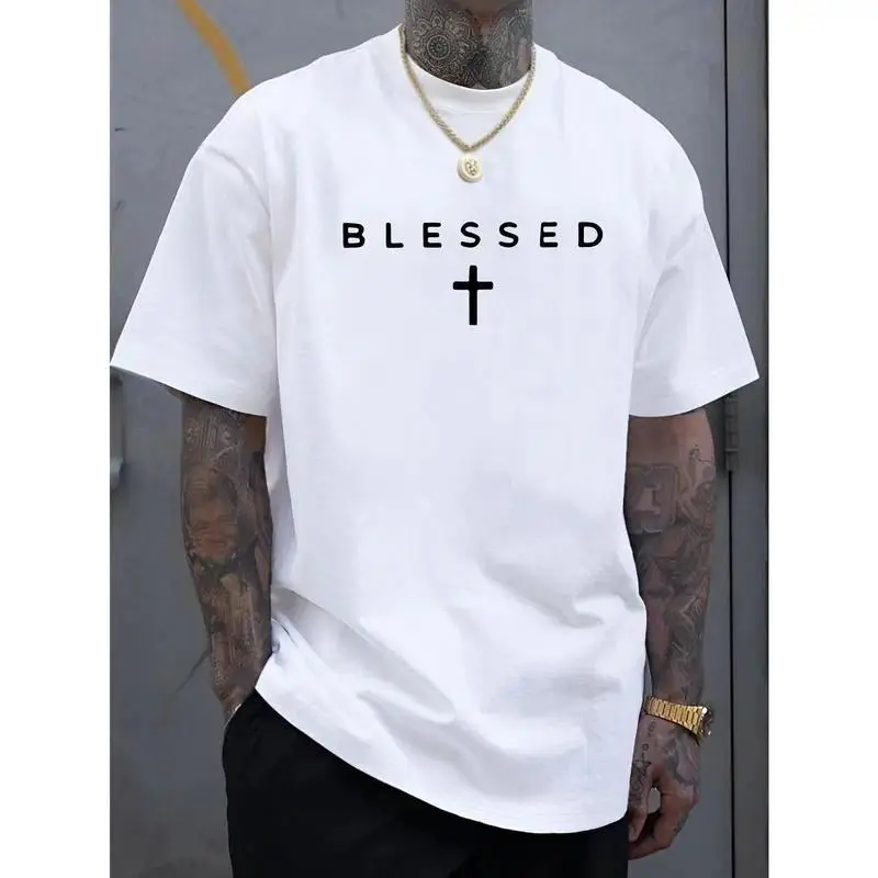 Men'S Casual Crew Neck T-Shirt with Cross & "BLESSED" Letter Print, 100% cotton Knit Fabric, Regular Fit Short Sleeve Tee for Summer, Comfortable & Versatile Weekend Casual Wear, Everyday Tshirt |         Sleek Black Tee |         Lightweight FabricMen'S Casual Crew Neck T-Shirt with Cross & "BLESSED" Letter Print, 100% cotton Knit Fabric, Regular Fit Short Sleeve Tee for Summer, Comfortable & Versatile Weekend Casual Wear, Everyday Tshirt |         Sleek Black Tee |         Lightweight FabricMen'S Casual Crew Neck T-Shirt with Cross & "BLESSED" Letter Print, 100% cotton Knit Fabric, Regular Fit Short Sleeve Tee for Summer, Comfortable & Versatile Weekend Casual Wear, Everyday Tshirt |         Sleek Black Tee |         Lightweight Fabric