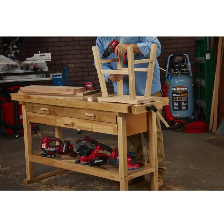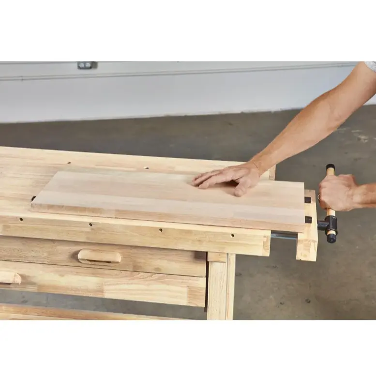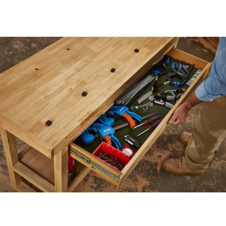 The YUKON 60 in., 3-Drawer Hardwood Workbench provides over 1200 sq. in. of workspace for a wide variety of woodworking projects. This workbench has a hardwood top with 4 anvil pegs and 4 wood pegs for securing workpieces. The 7 in. wood block vise holds workpieces without marring. Three felt-lined drawers, one full width, provide easy storage and organization for tools and hardware.