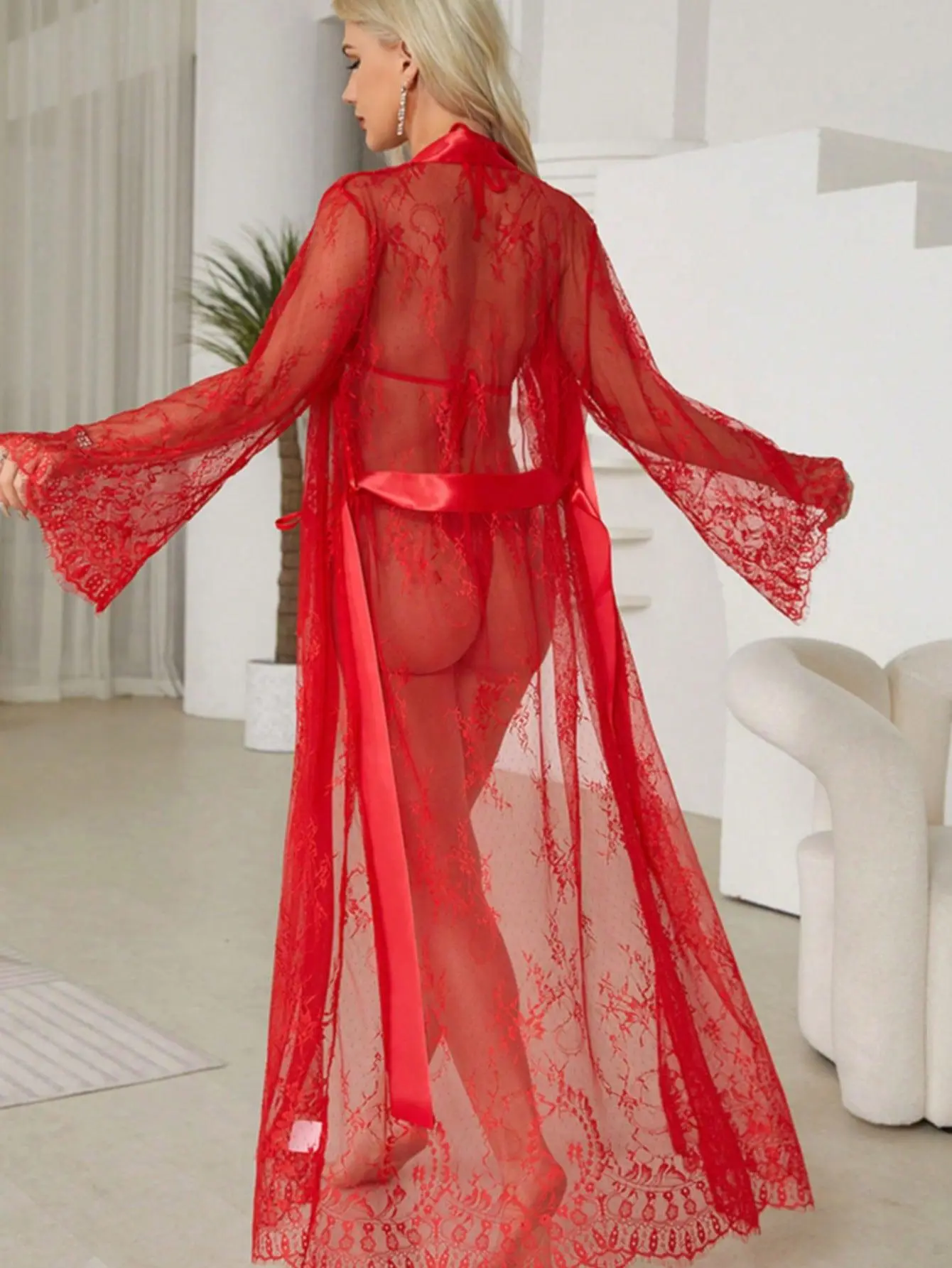 SOFUSEN Red Lace Lingerie Robe Set