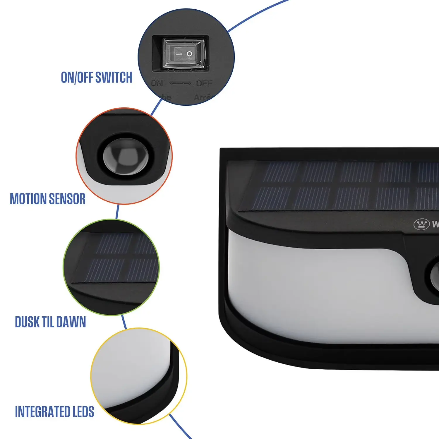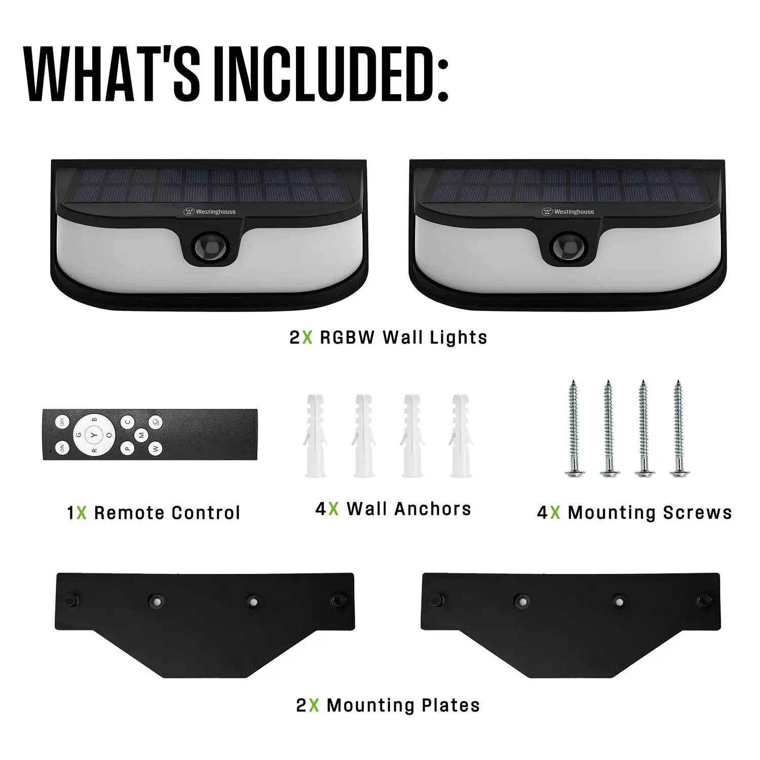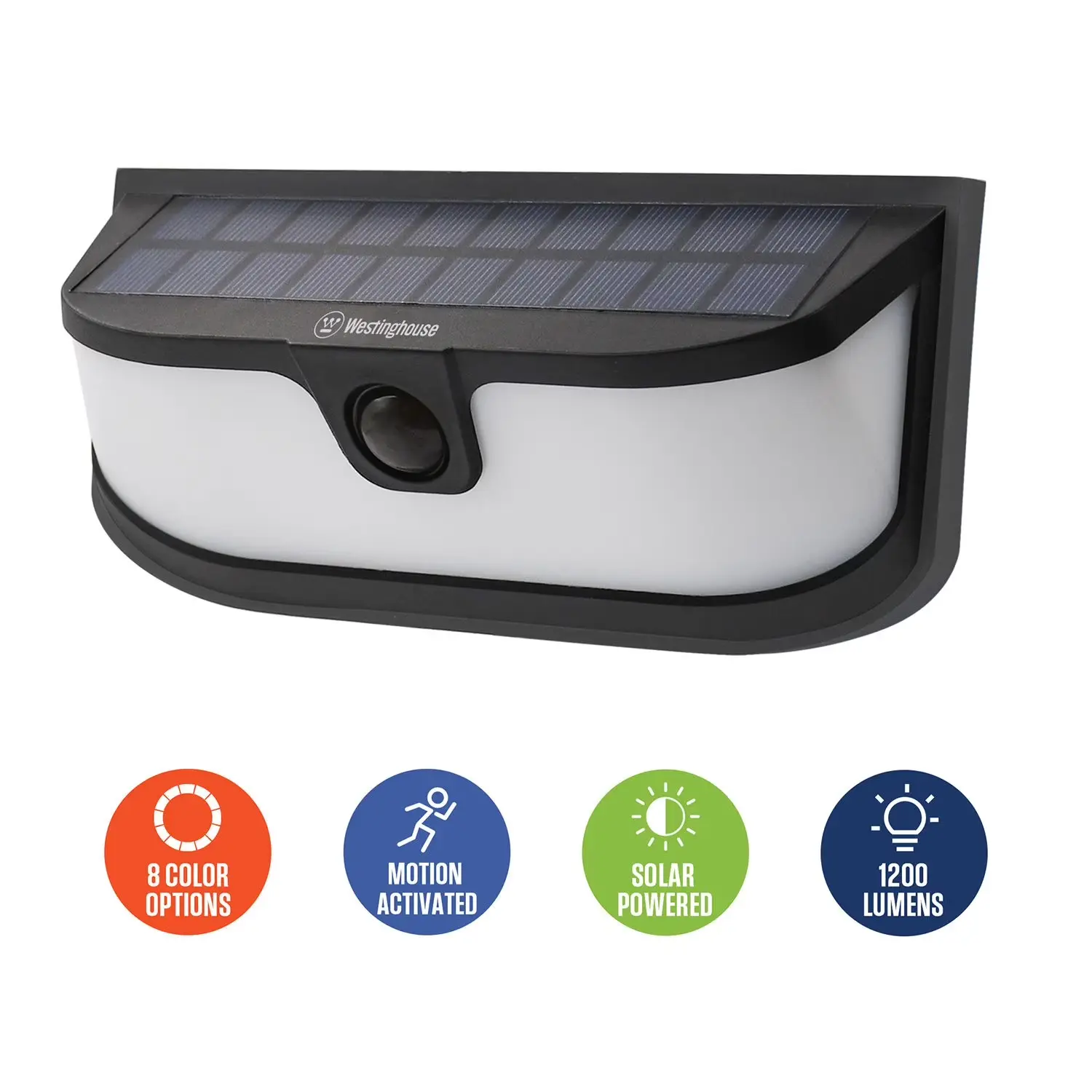 Transform your outdoor living space with the Westinghouse 1200 Lumen Solar Motion Activated Color Changing Wall Lights. These lights can be installed anywhere, allowing you to illuminate fencing, deck rails, steps, patios, driveways, and more to provide colorful or regular white light wherever you need it most. If you want to choose a solid color, the solar wall lights offer eight single-color options: Red, Yellow, Purple, Green, Blue, Cyan, Orange, and White. Simply press the button of the color you want on the included remote control. You can also choose a separate ""jump"" feature that cycles through all of the vivid, bright colors. Customize your favorite outdoor areas for holidays, birthdays, BBQs, parties, and everyday security or ambiance lighting.