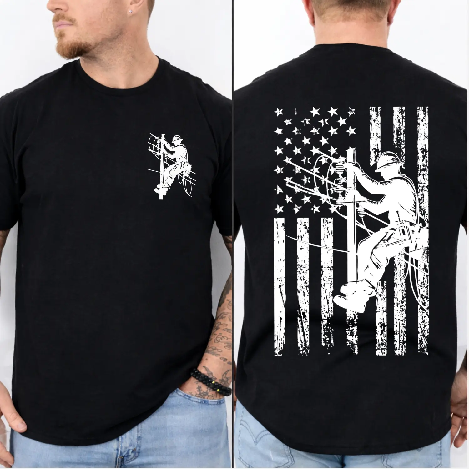 Lineman 2-Sided T-Shirt, Sweatshirt, Hoodie American Flag Electrician Tee, Utility Worker Shirt, Blue Collar Workwear Gift For Men For Husband
