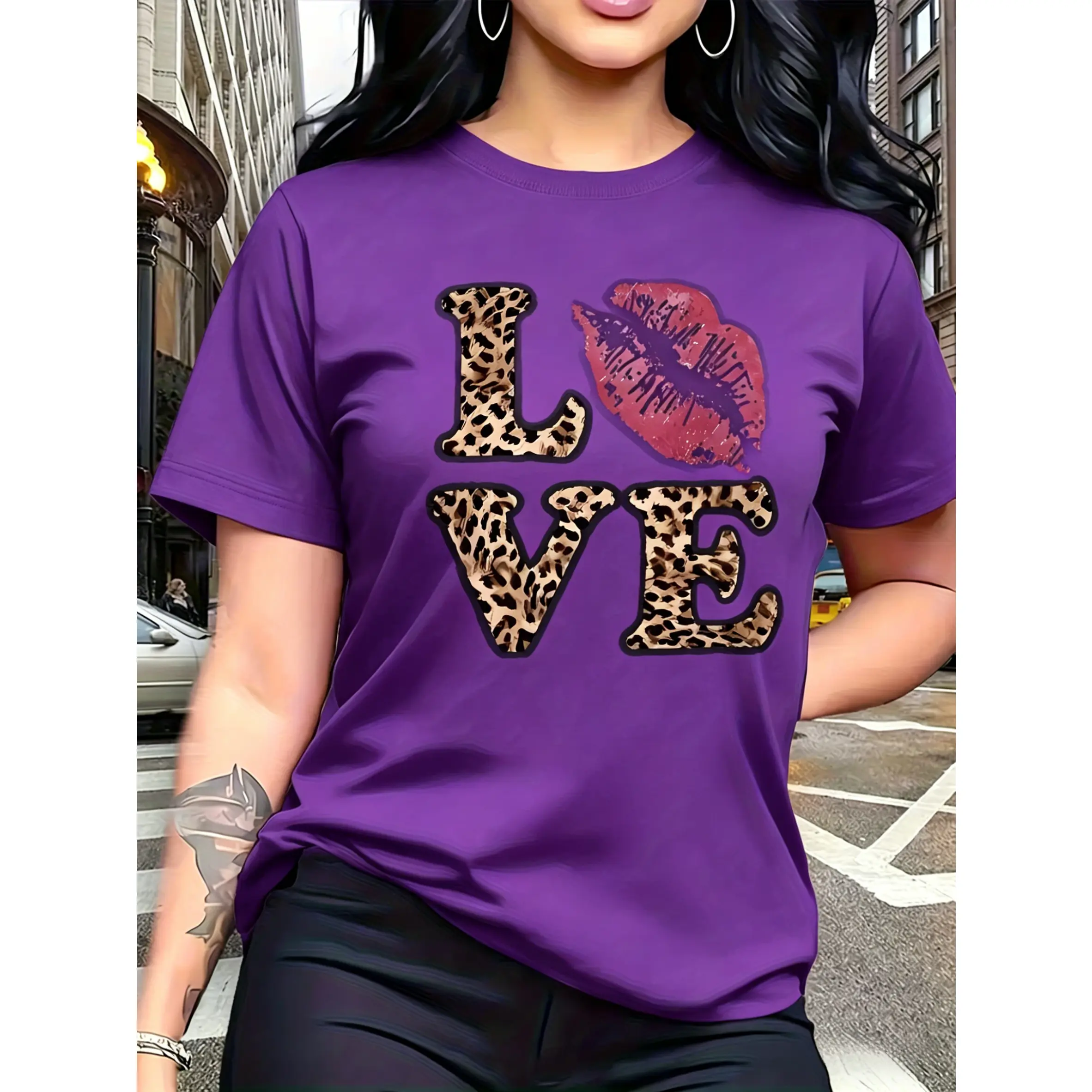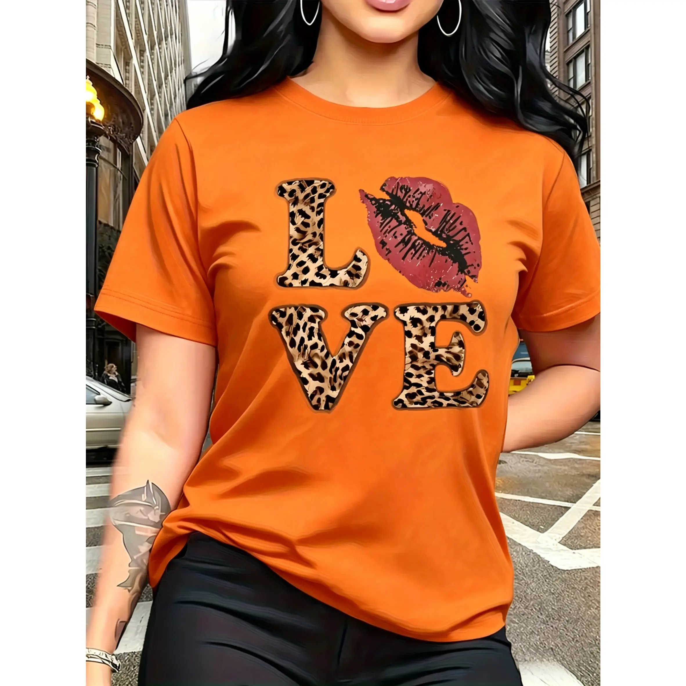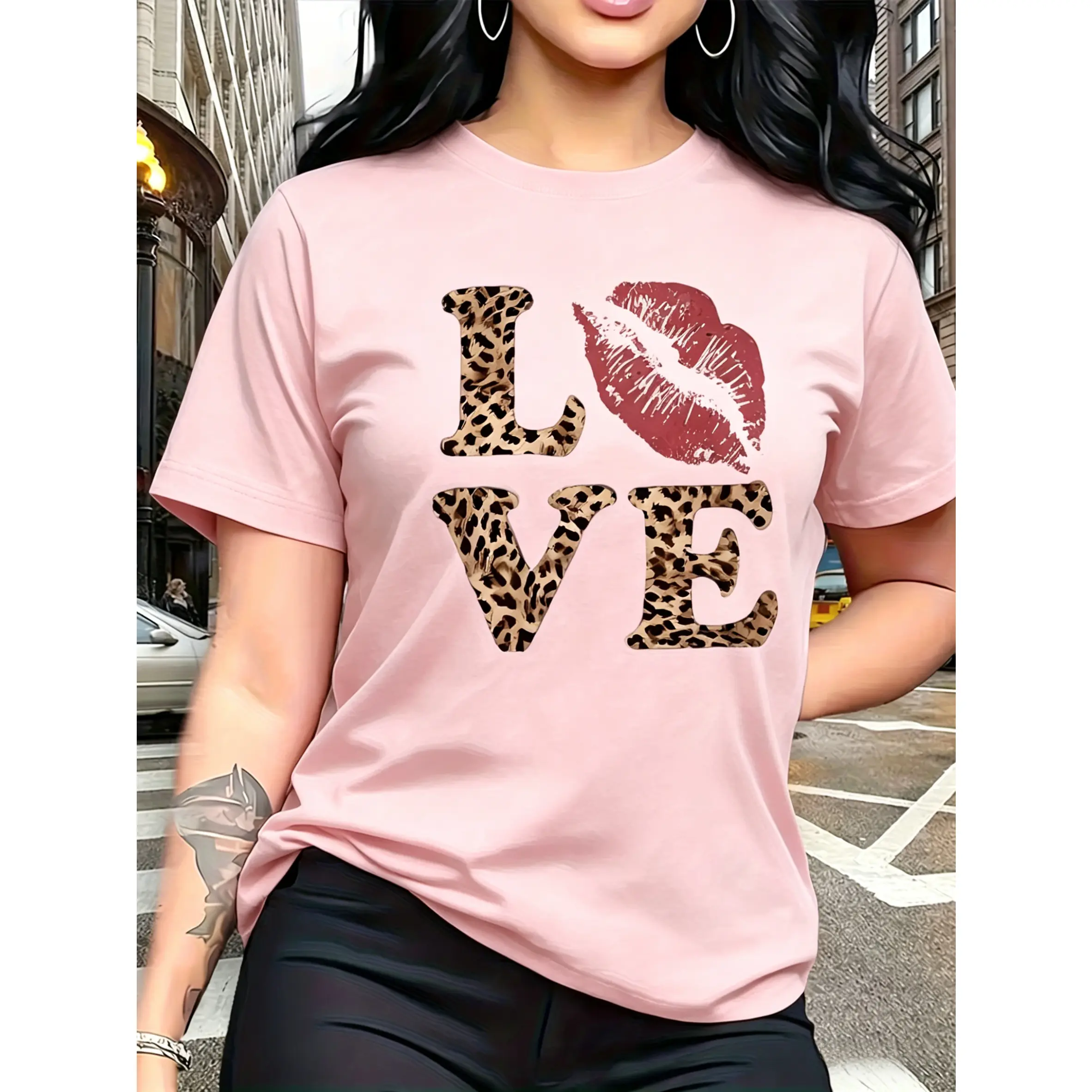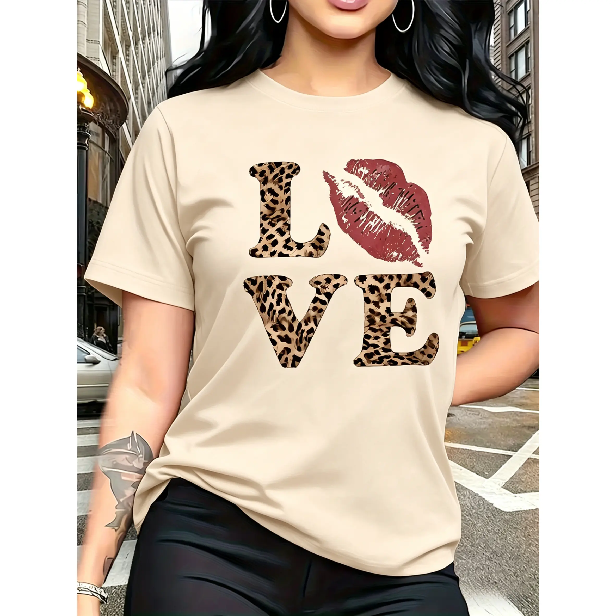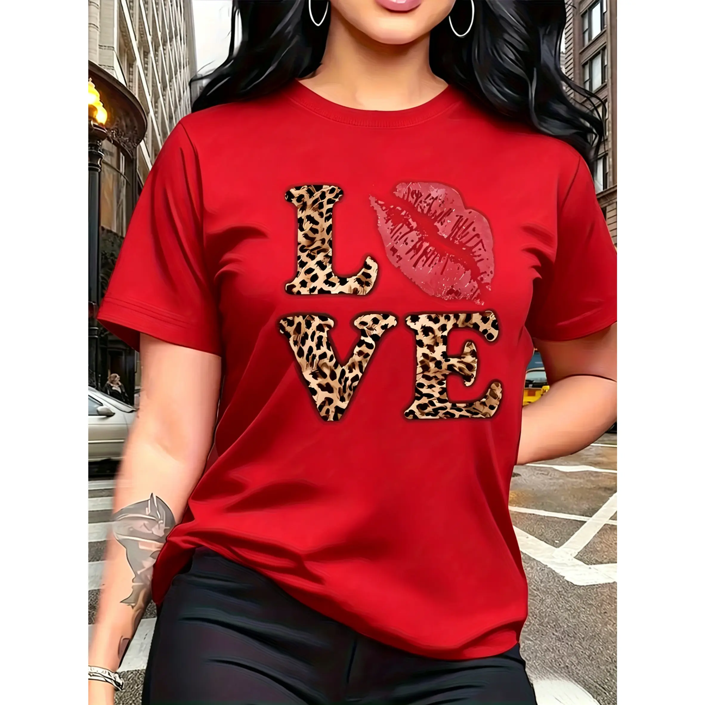 100% cotton, leopard print "LOVE" red lips pattern print, fashionable and breathable T-shirt, suitable for family trips, campus activities, casual sports, daily commuting, matching outfits for sisters, versatile T-shirt