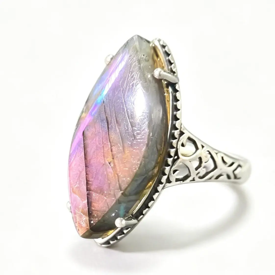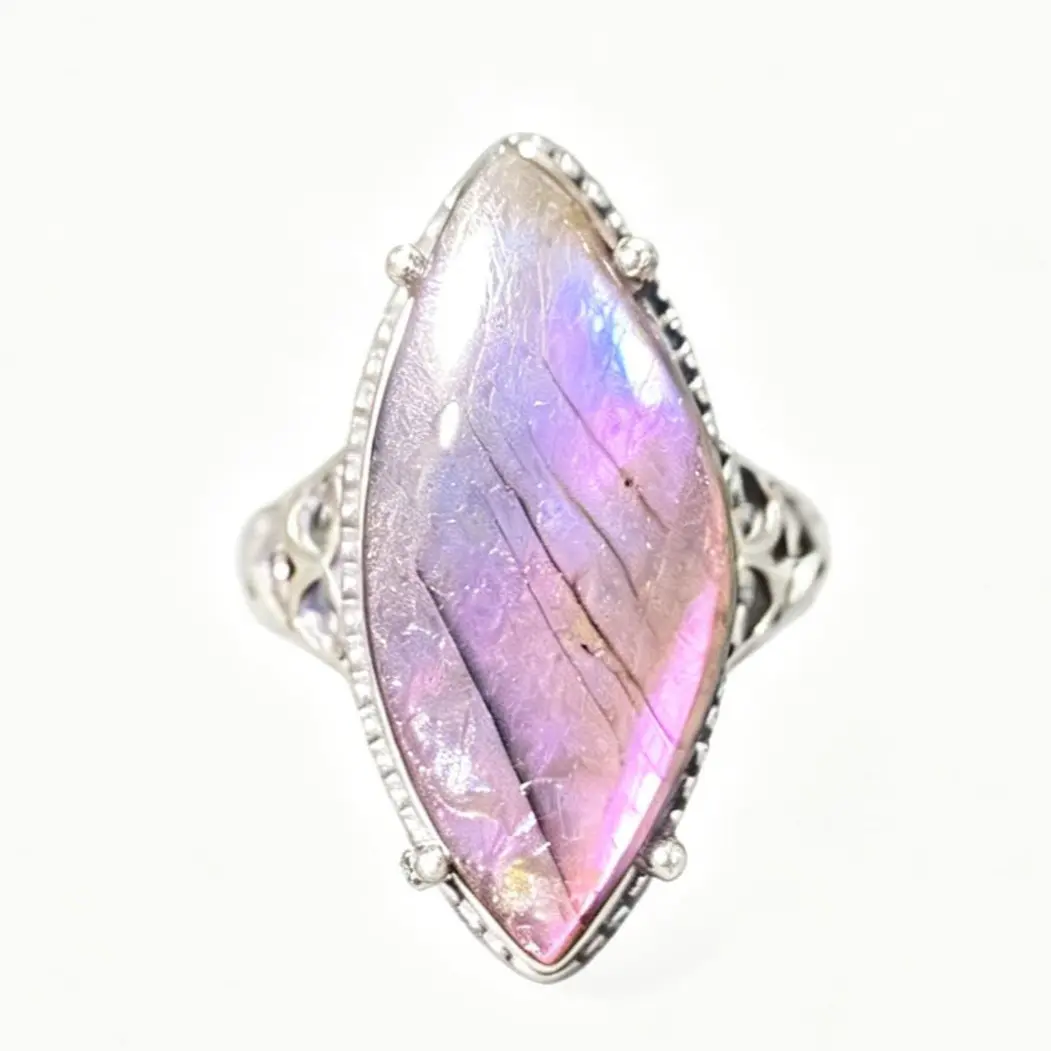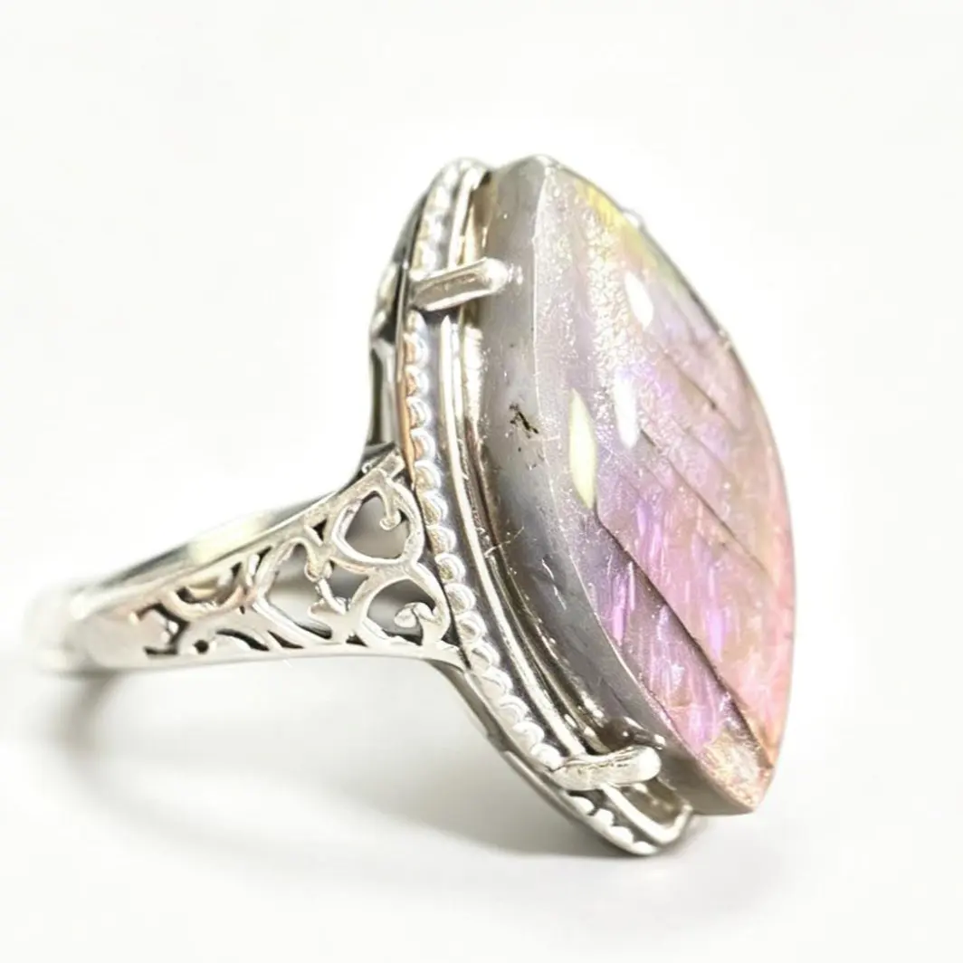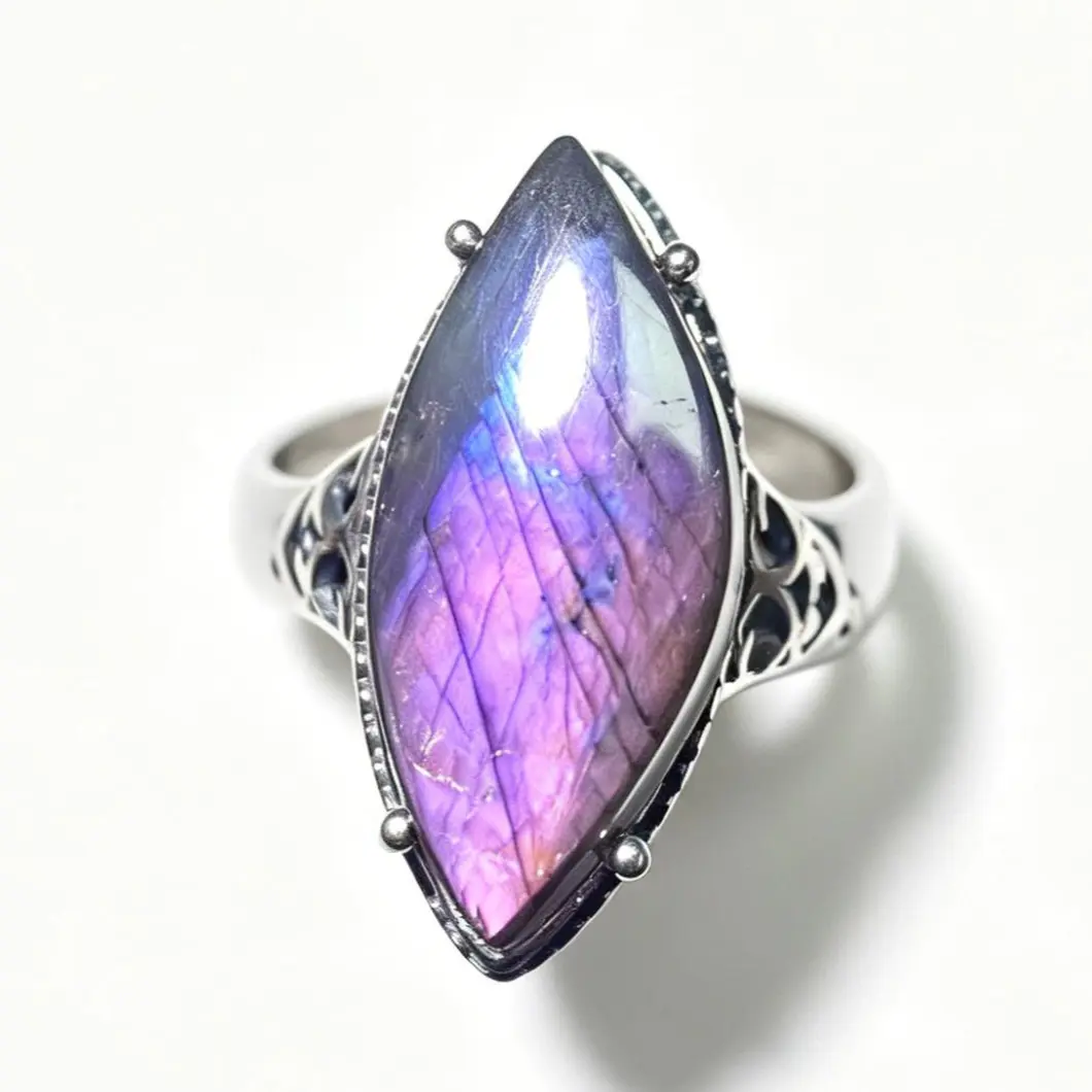 Mesmerizing Labradorite Flash (Schiller Effect): The star of this ring is a premium marquise-cut labradorite that transforms in every light. Watch it shift between vivid magenta, iridescent purple, soft blue, and warm amber hues as you move it—no two angles look the same, making your ring truly one-of-a-kind.