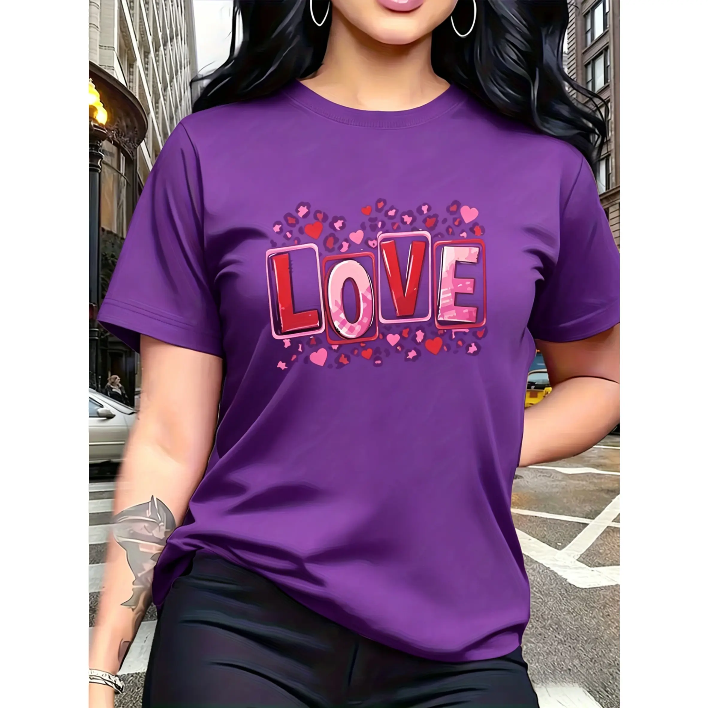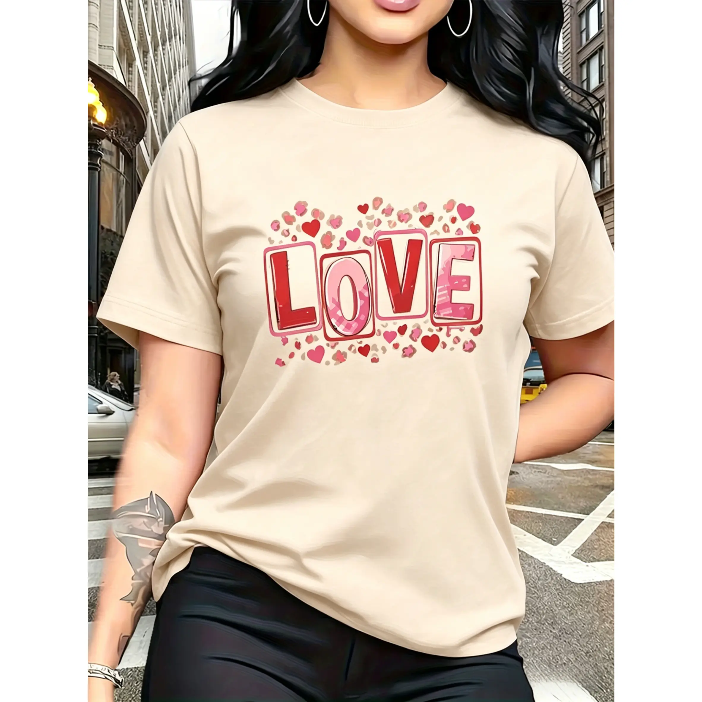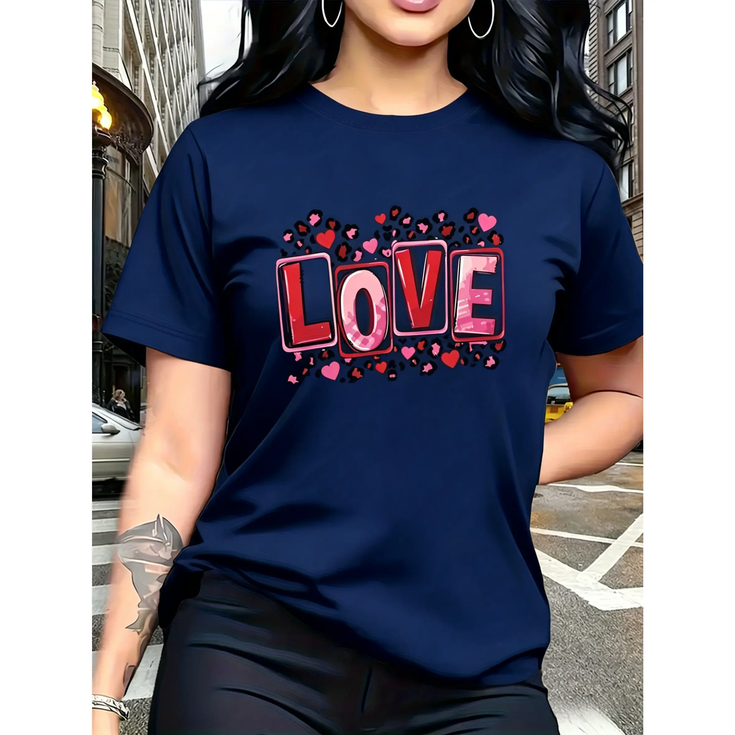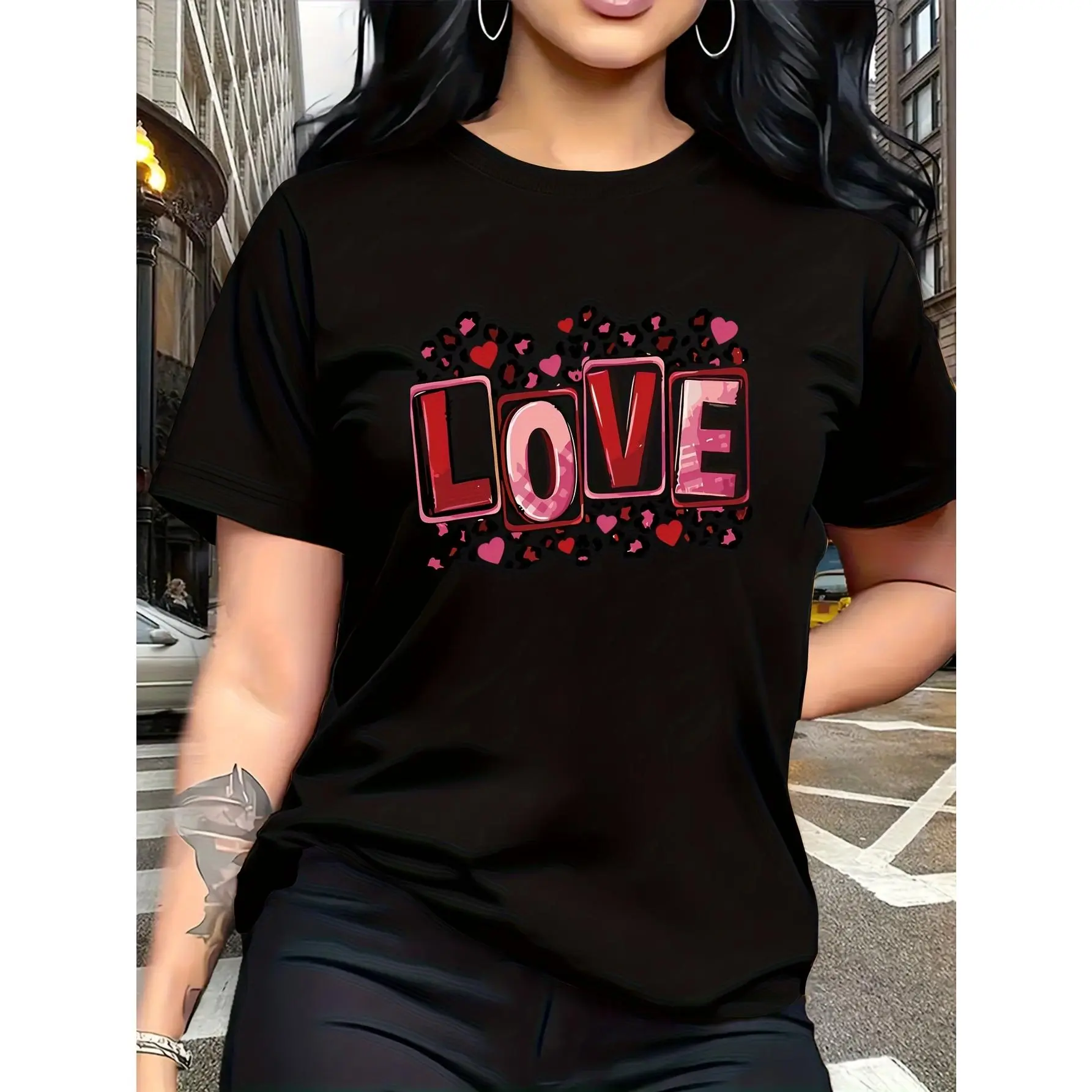 100% cotton, the back features leopard print and heart motifs, with letters printed in different styles of red and pink tones, trendy and fashionable. The simple round-neck, casual and versatile short-sleeve women's T-shirt is suitable for leisure