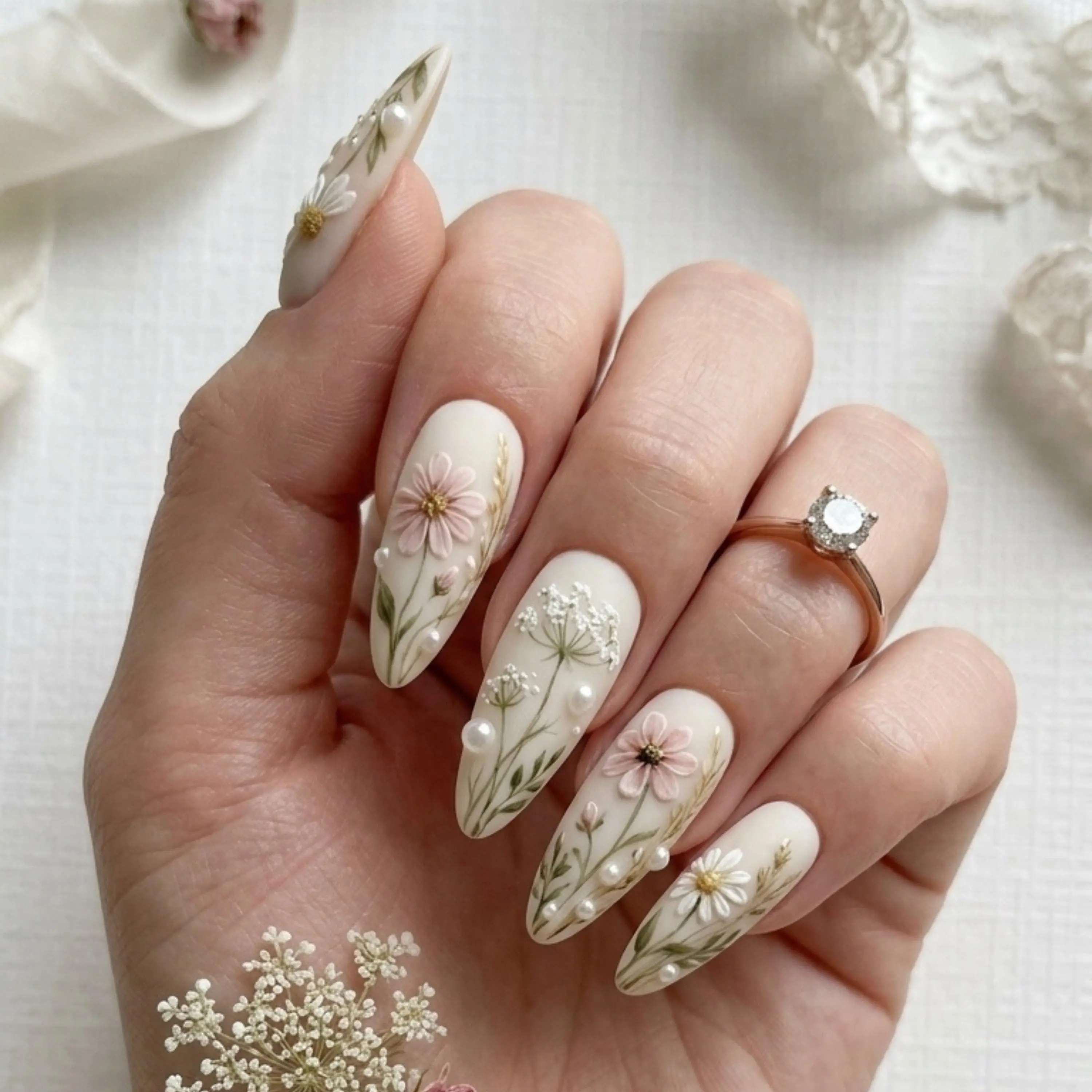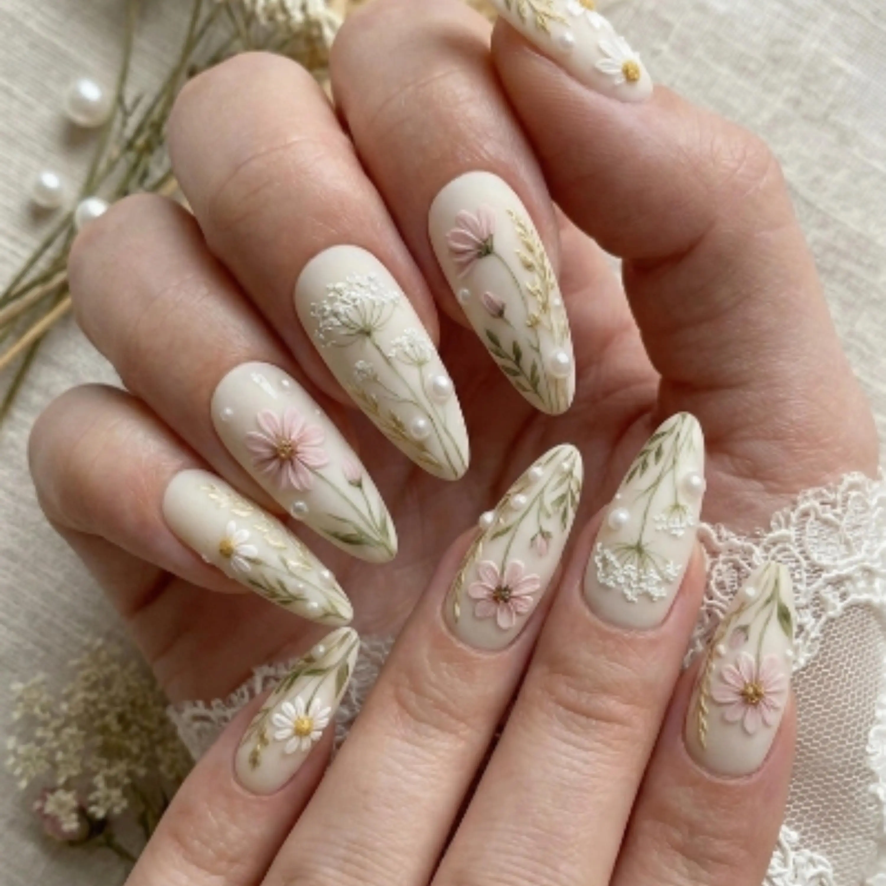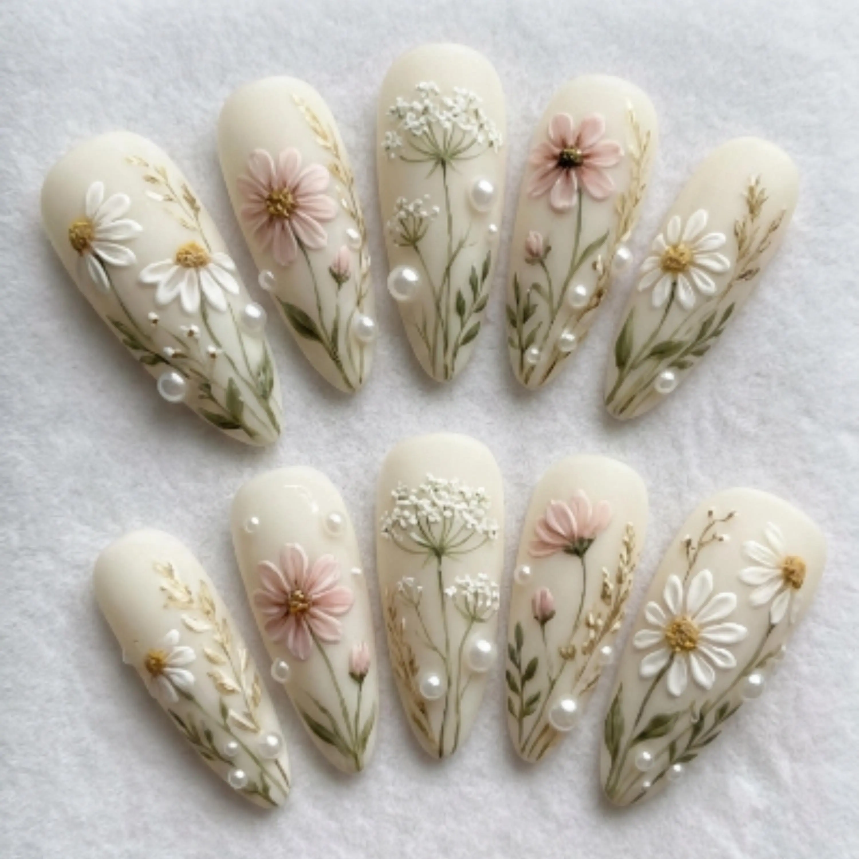 3D Wildflower Bridal Press On Nails | Luxury Matte Cream Pearl & Gold Botanical Art