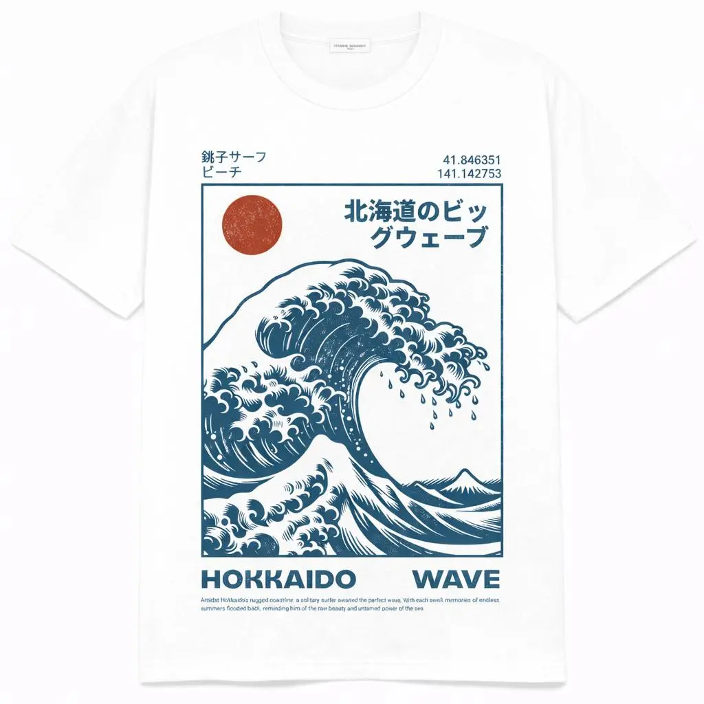 Hokkaido Wave Shirt, Retro Japanese Surf Tee, Ukiyo‑e Great Wave Graphic T‑Shirt, Vintage Japanese Beach Style Top