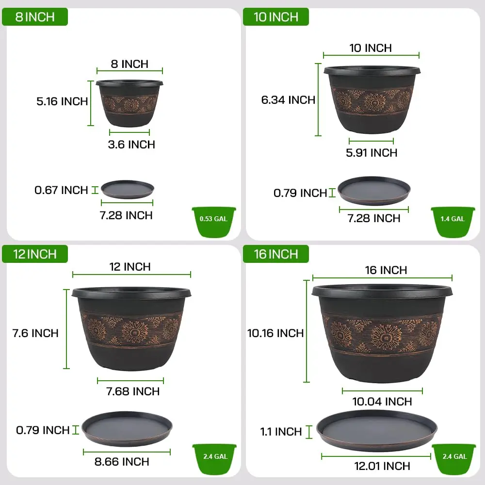 4 Pack 10 inch Plant Pots, Retro Pattern Planters with Drainage Holes and Saucer, Sturdy Plastic Garden Flower Pots for Indoor & Outdoor Plants