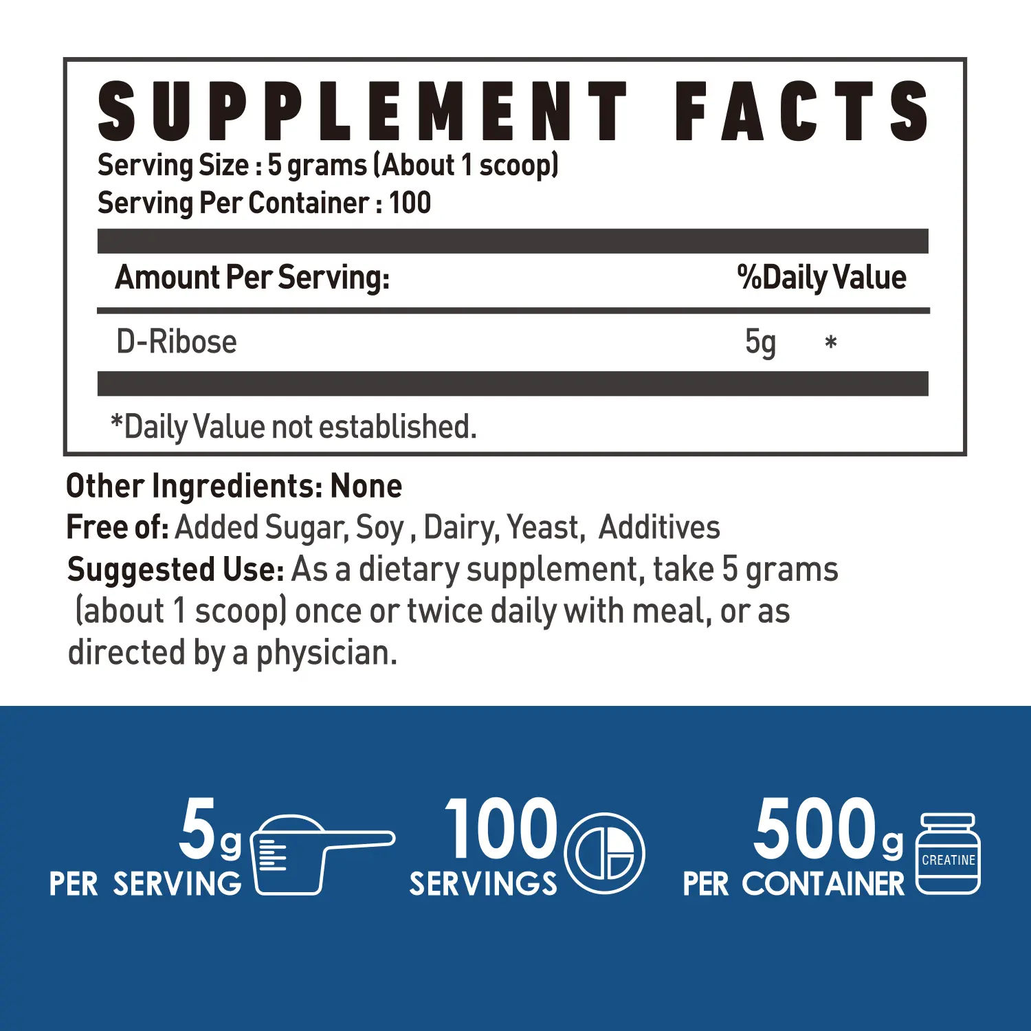 ·Pure D-ribose Powder, 1.1 lbs (500g), Unflavored, Filler Free, No Artificial Colors, No Irradiation, and No Gluten, Non-GMO and Vegan Friendly. You can add it to your favorite smoothie or juice.