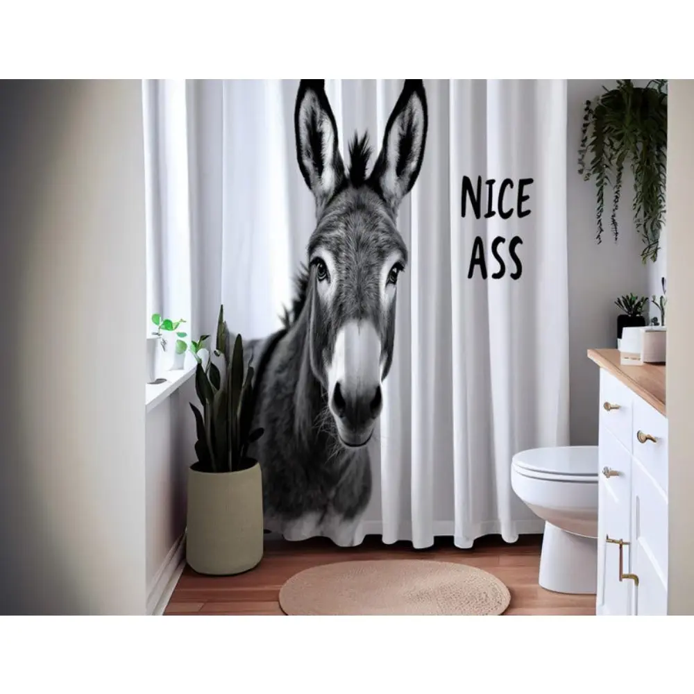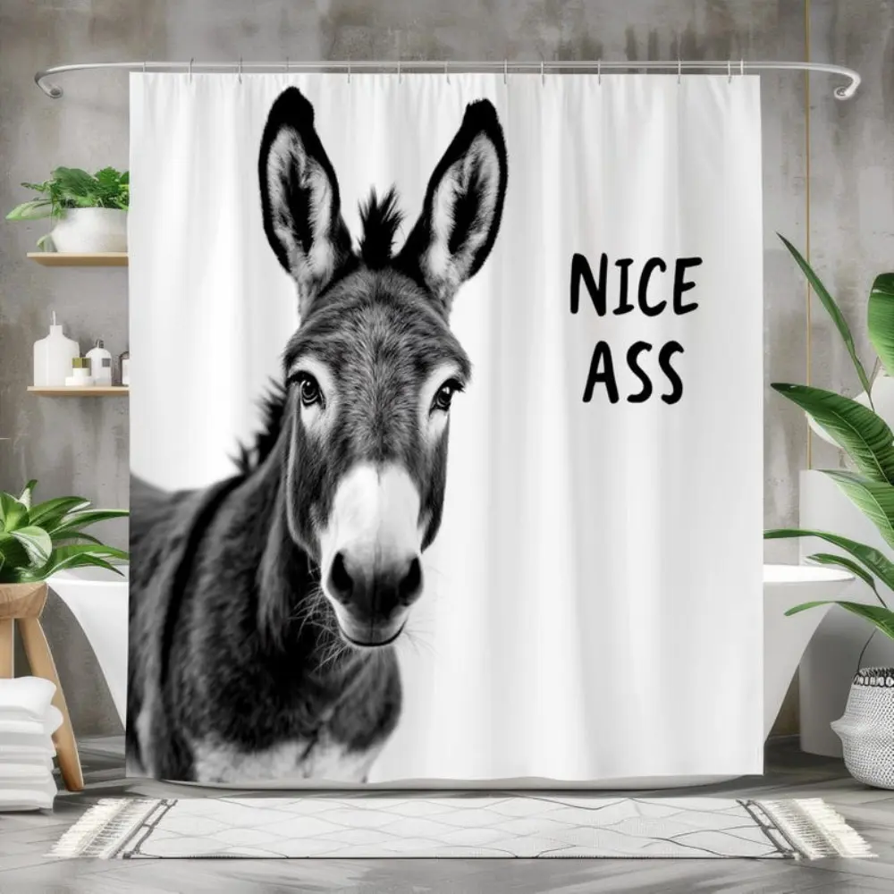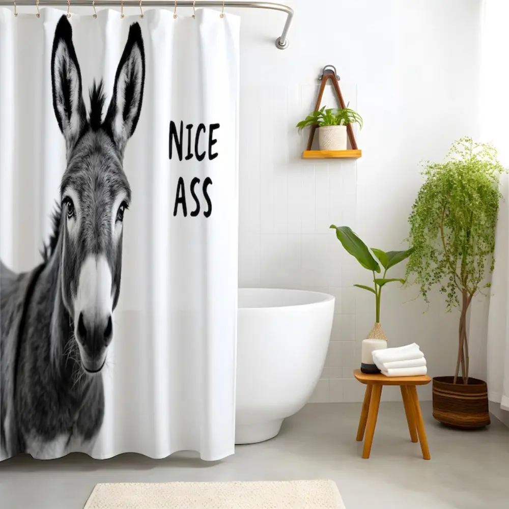 Funny Donkey Shower Curtain, Nice Ass Text Hilarious Farmhouse Fabric Bath Decor with Hooks, Gag Gift for Him or Her