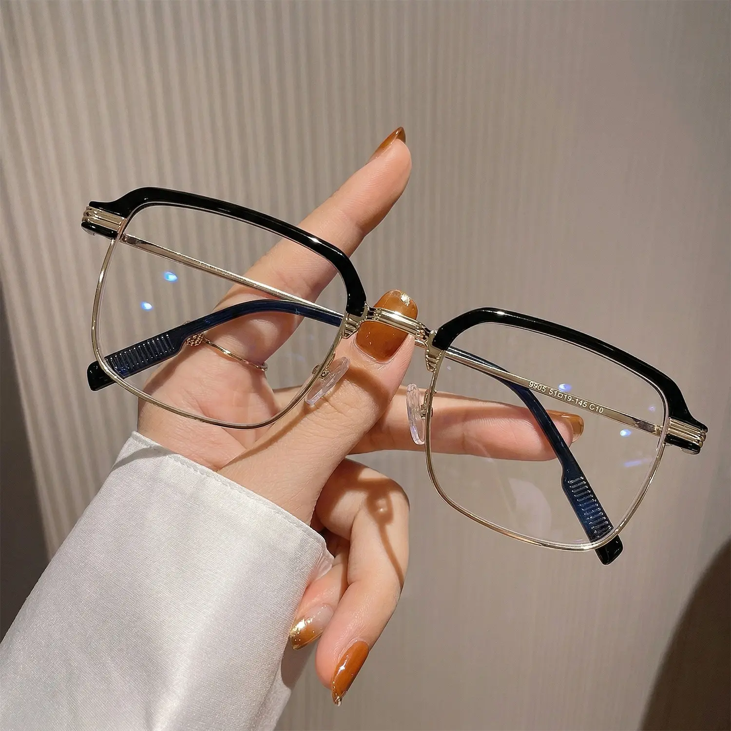 Sleek black-and-gold semi-rim frame, simple yet elegant. Complements all face shapes, suits both men and women, and gives you a more youthful, refined look.