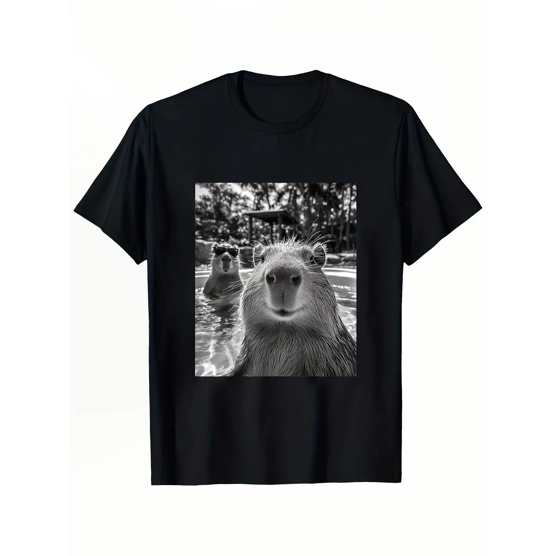 Youth Cool Capybara Selfie Pattern T-Shirt- Black Casual Crew Neck Top with Fun Animal Print, Machine Washable, All-Season Comfortable Boys' Clothing