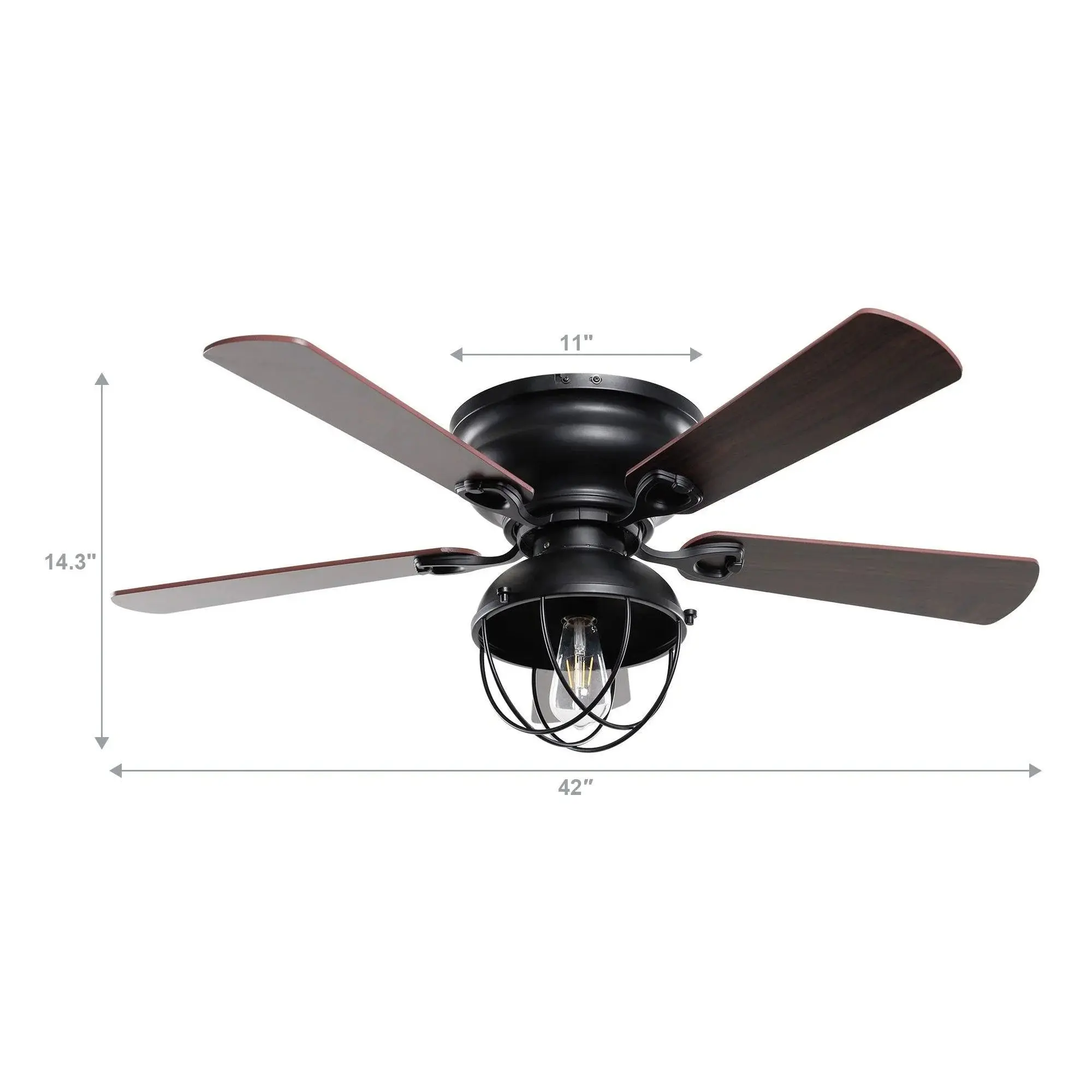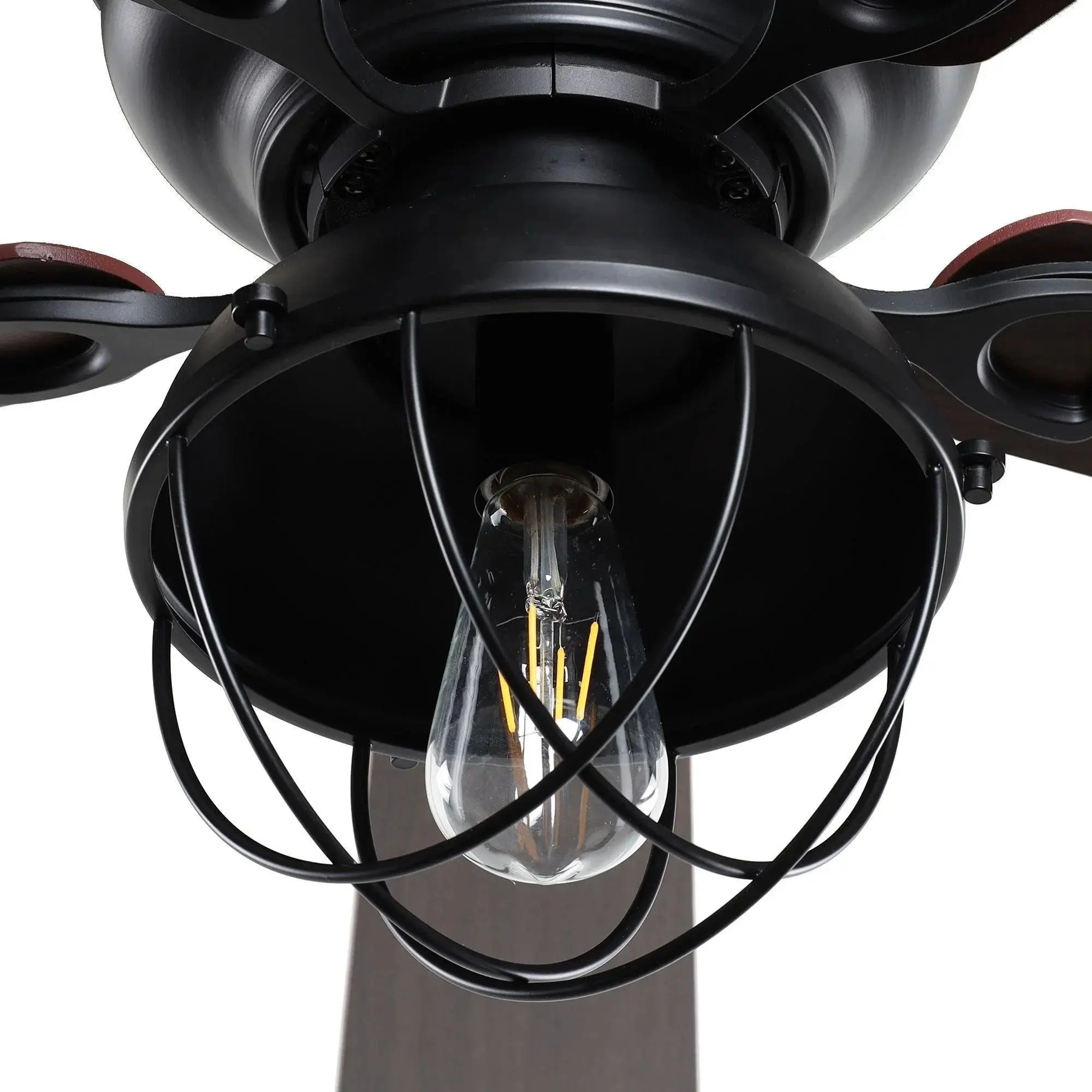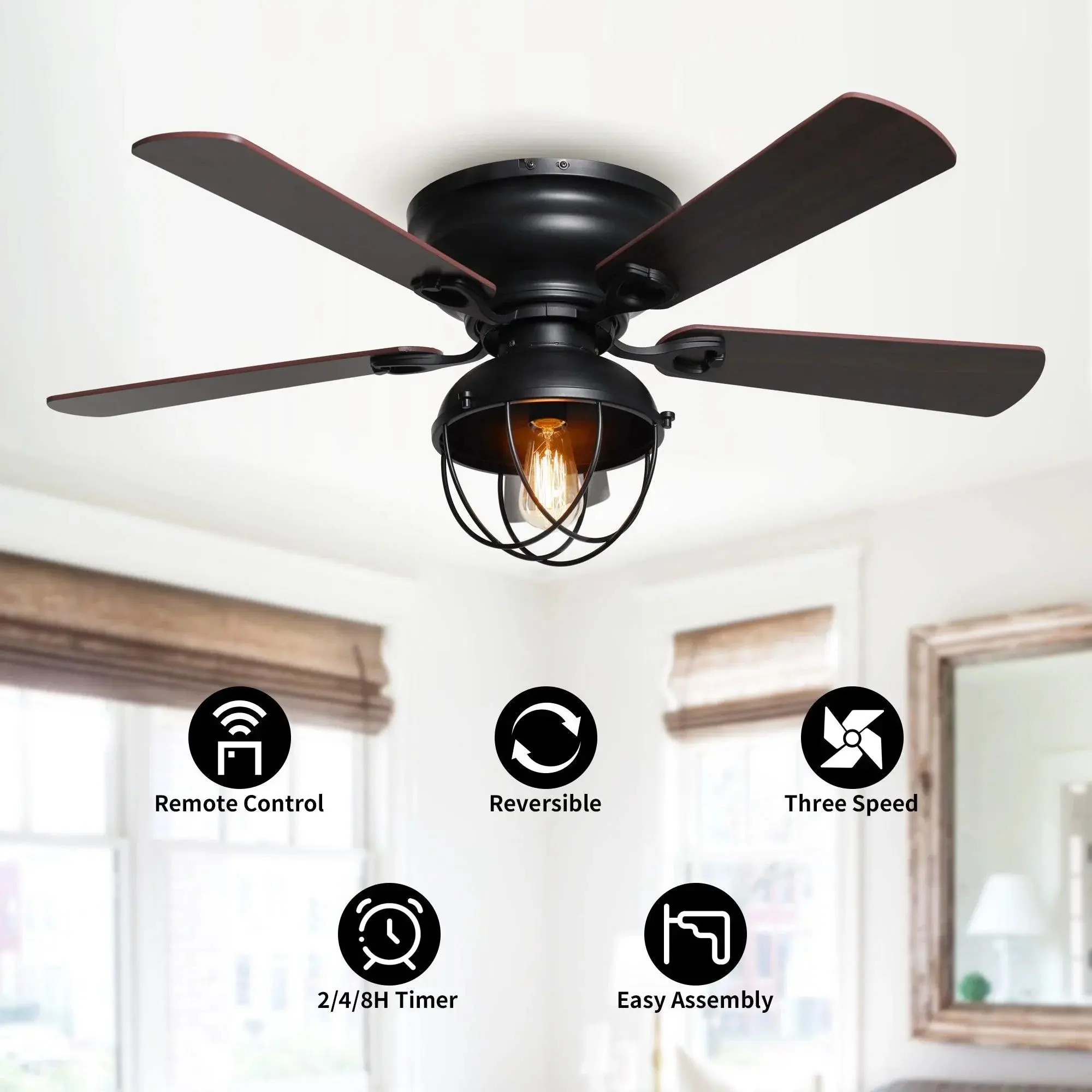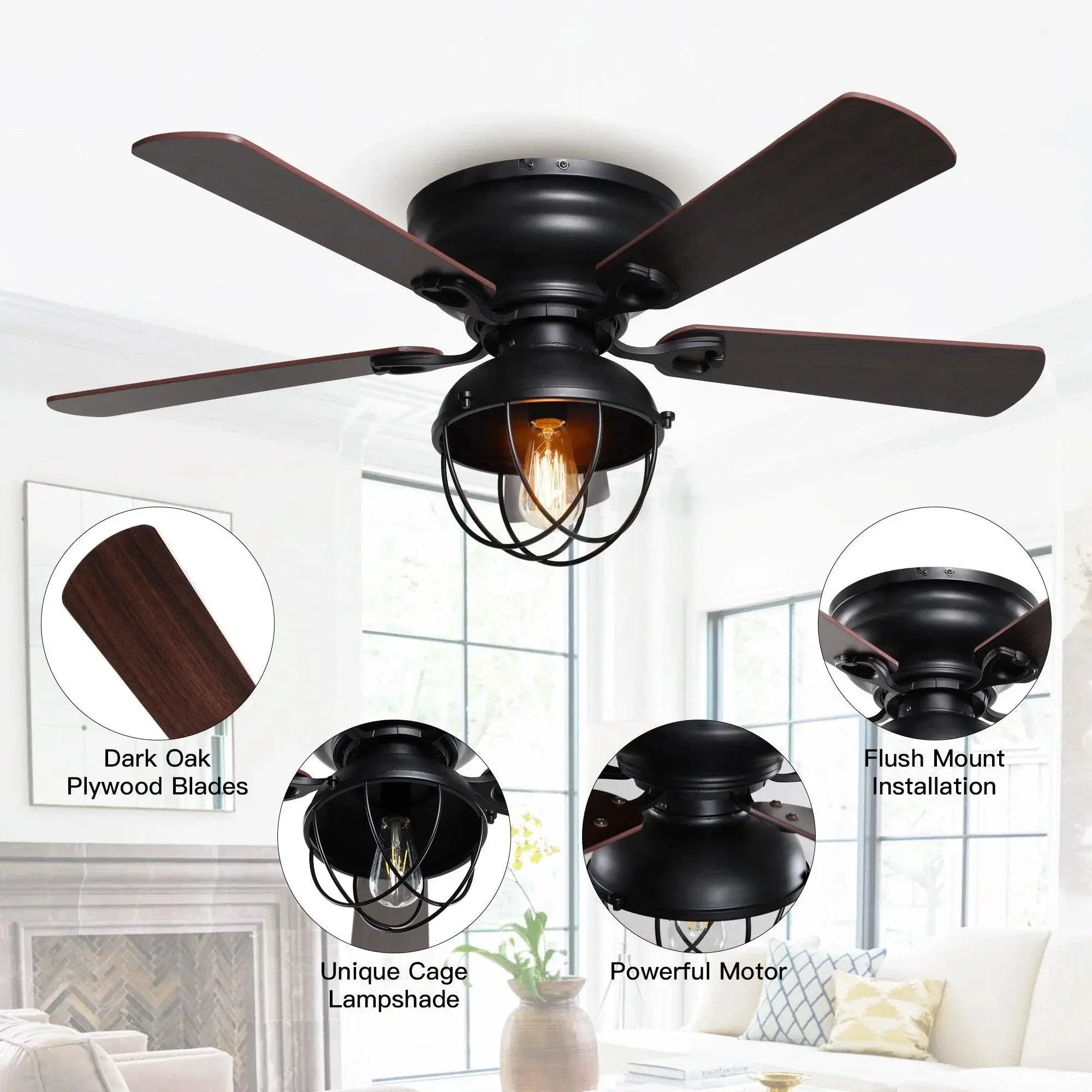 ·LIGHTING & CEILING FANS: Low profile ceiling fan and caged light 2 in 1. Equipped with powerful and ultra-quiet motor, matte black body with 5 brown finished blades, Perfect for rooms around 300 square feet, such as living room, bedroom, dining room or covered patios.
