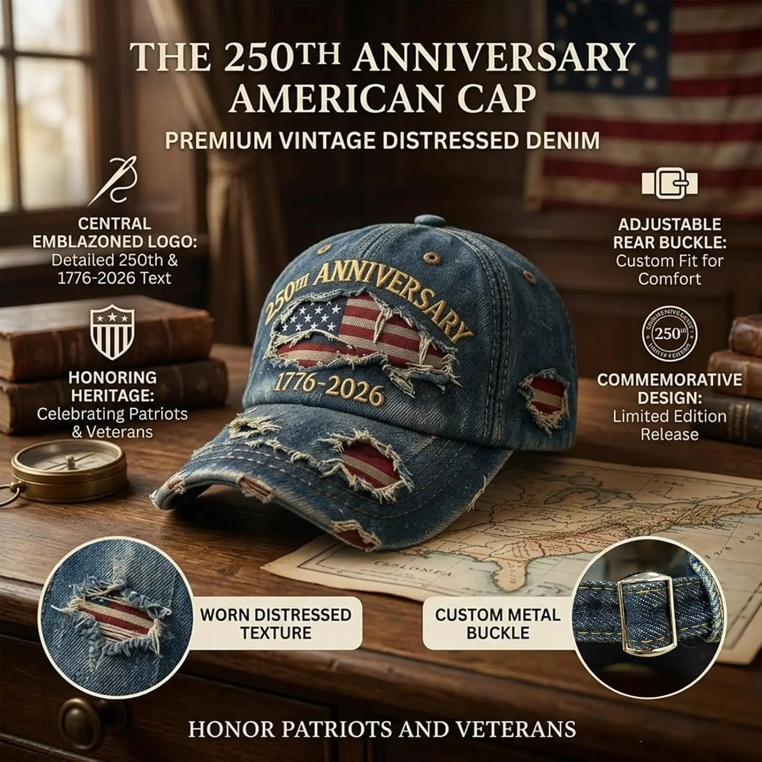 ·Retro Embroidered Craftsmanship: Crafted with a vintage washed denim technique, this 250th anniversary US hat offers a lived-in, comfortable feel. The durable embroidery blends classic style with everyday wearability.