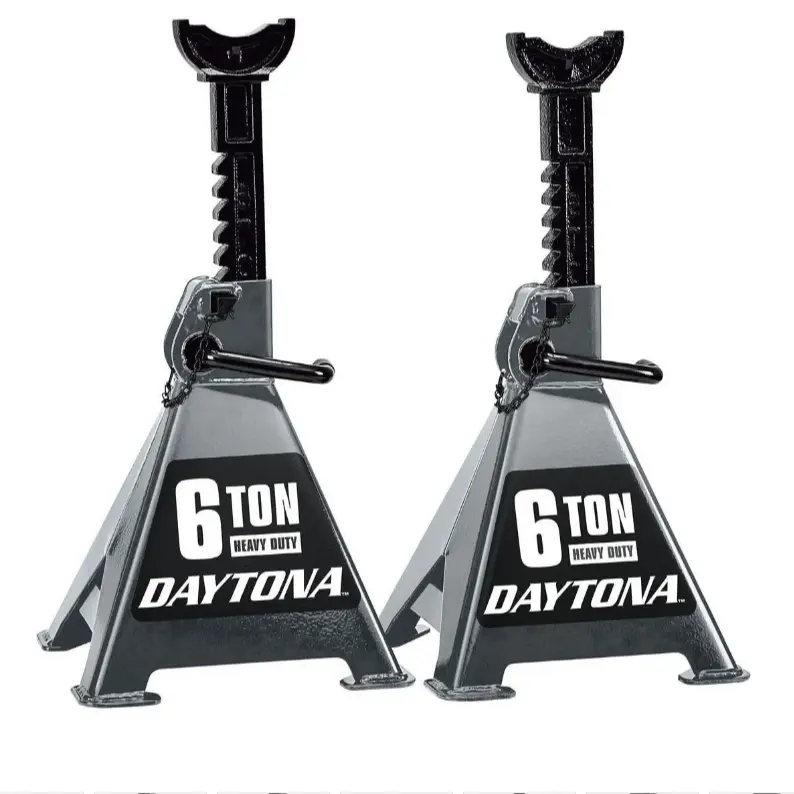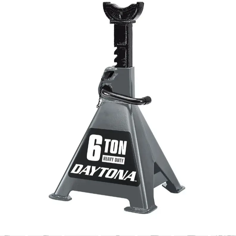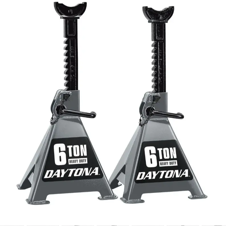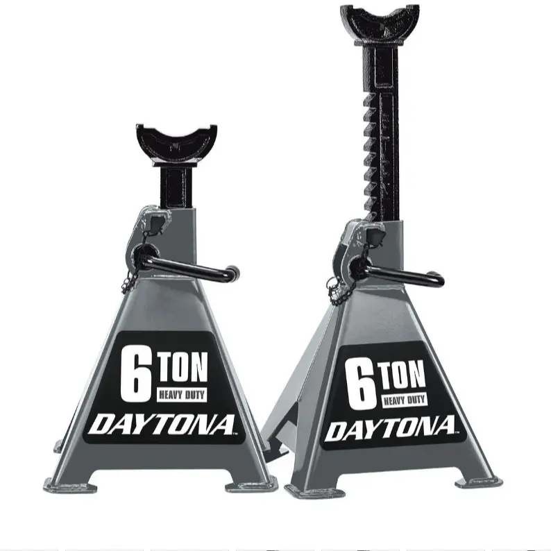 The DAYTONA Heavy Duty Jack Stands safely support up to 12,000 lb., offering stable, dependable protection. They are constructed with heavy duty, solid steel body panels and welded-in reinforcement braces for added strength and durability. These jack stands feature an easy-to-use ratcheting system to make quick height adjustments and double-locking mobility pins for extra safety and security.