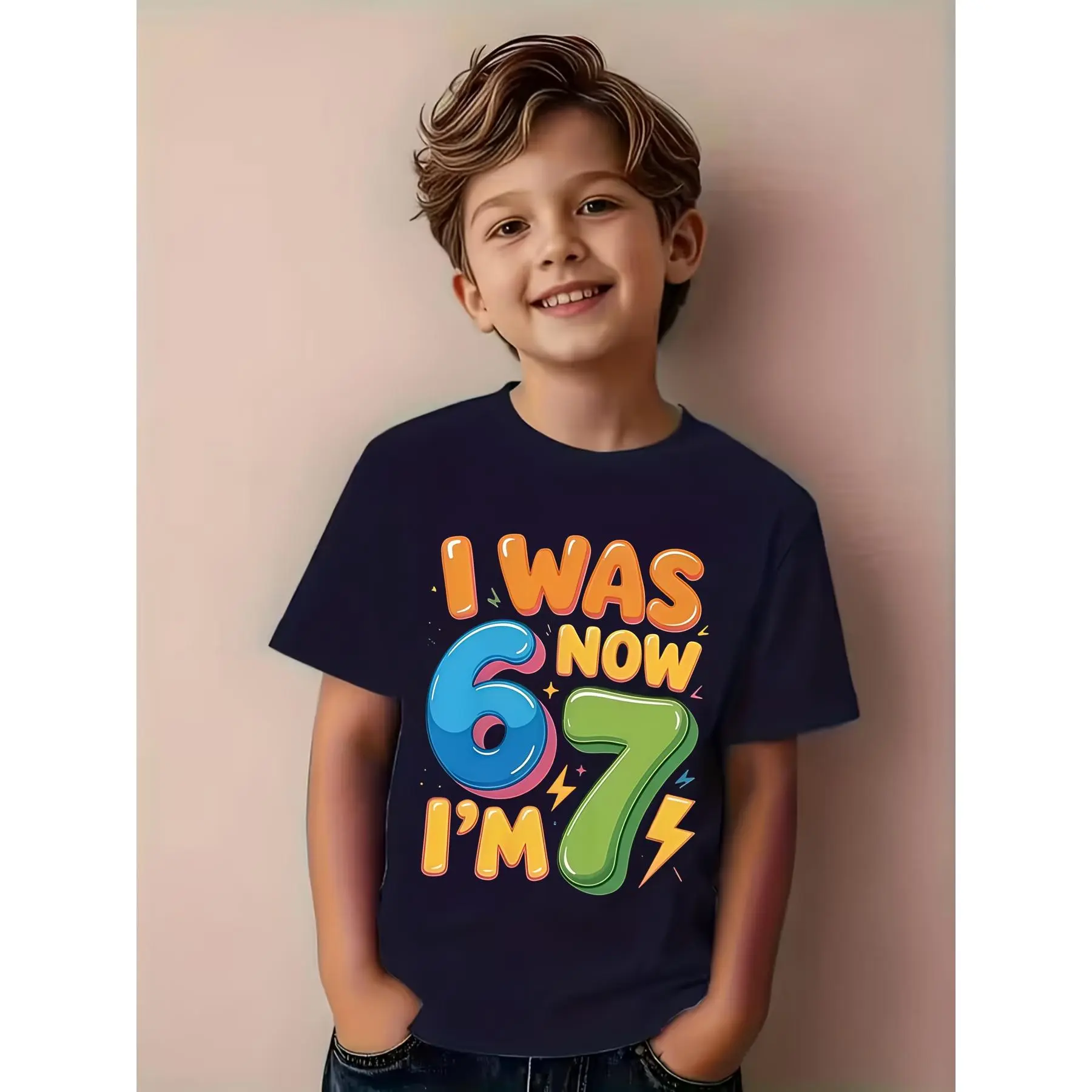 7th Birthday T-Shirt - Fun "I'm 6, Now I'm 7" Number 67 Design with Balloons and Confetti - Soft, Breathable Crewneck Casual Tee for 7-Year-Old Boys - Comfortable All-Season Birthday Party Outfit - Ideal Gift for 7th Birthday Celebrations