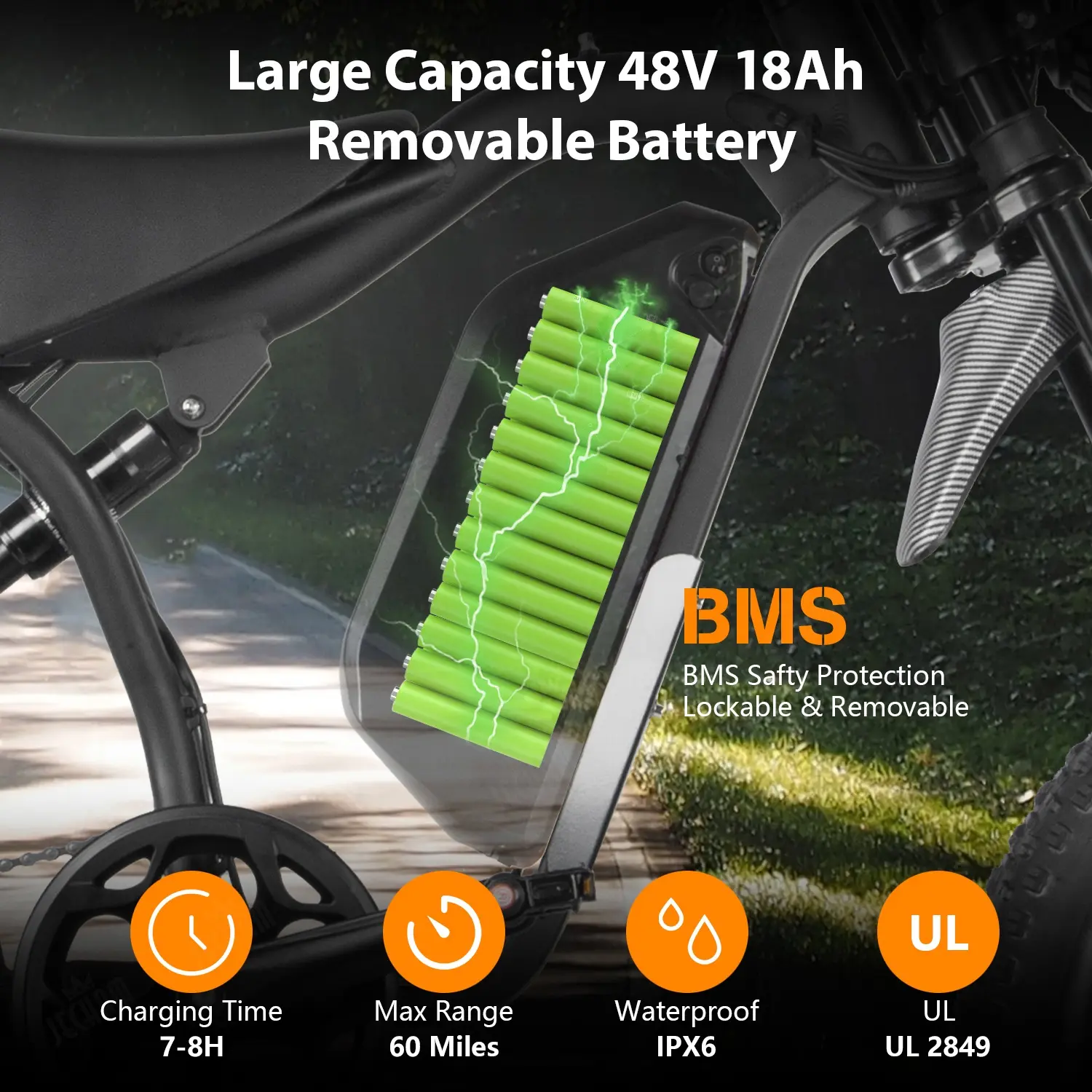·60 Miles Range: Powered by a 48V 18Ah High-Capacity Battery — ride all day without frequent charging (Note: Actual range may vary by load, temperature and road conditions)