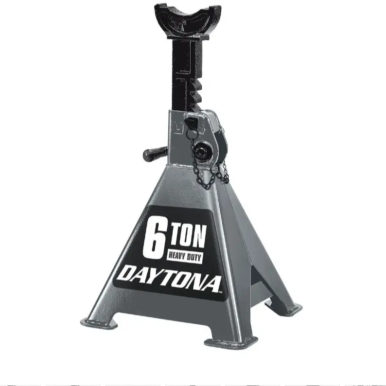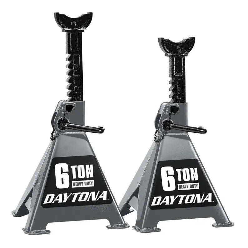 The DAYTONA Heavy Duty Jack Stands safely support up to 12,000 lb., offering stable, dependable protection. They are constructed with heavy duty, solid steel body panels and welded-in reinforcement braces for added strength and durability. These jack stands feature an easy-to-use ratcheting system to make quick height adjustments and double-locking mobility pins for extra safety and security.