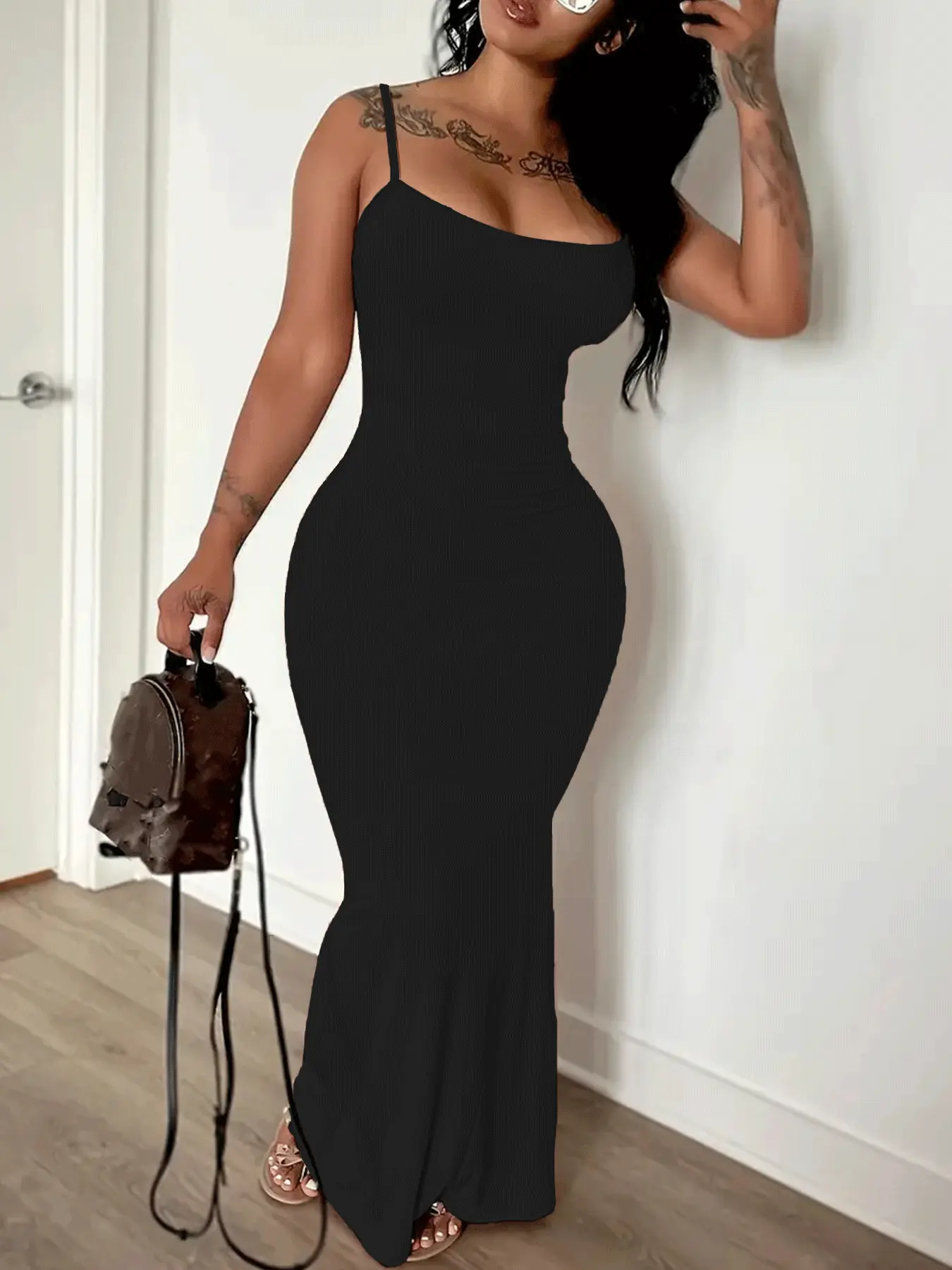 PUMIEY Women's Minimalist Bodycon Maxi Cami Dress Comfort Spaghetti Strap Womenswear Tight Dresses for Holiday Party Daily Wear Casual Sleeveless Dress Basic Ladies Clothing Lady Casual Wear Summer Summervibes
