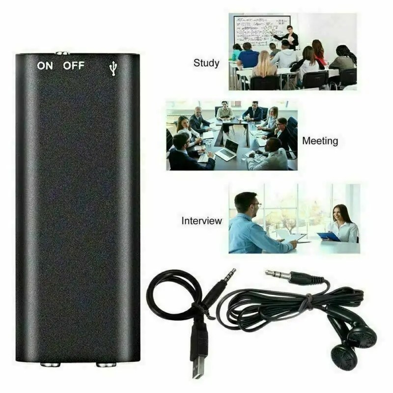 Dimensions:43*23*5mm Weight: about 8g Color: Black Memory:Built-in 8GB/16GB/32GB for option 8GB storage of recording files for 96 hours 16GB storage of recording files for 192 hours 32GB storage of recording files for 384 hours Recording format: WAV Bitrate:192Kbps NSR:≥70db Frequency:20Hz-20KHz Microphone: large-scale high sensitivity mic Working time: Continue Recording around 13 hours. Music format: MP3, WAV, WMA Recording mode:Voice-activated/ manual control Voice-activated sensitivity: Can not adjust Earphone:3.5mm earphone Built-in battery:built-in lithium polymer battery Listening to songs with headphones can last for 28 hours. Connect: Micro USB2.0/OTG Working Temperature:-5~45℃
