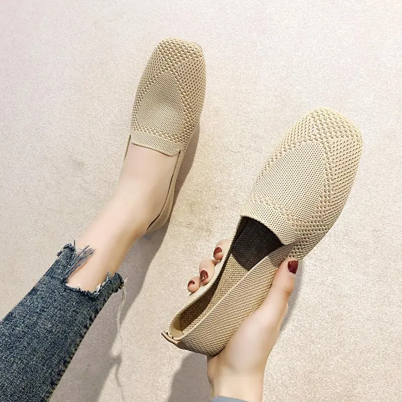 2026 Women's Breathable Knit Slip-On Flats | Soft Sole Square Toe Boho Print Casual Walking Shoes