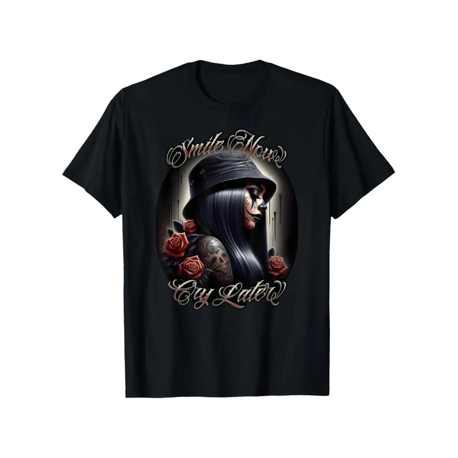 Chicana Payasa Tattoo Art Cotton T-Shirt With Smile Now Cry Later Design