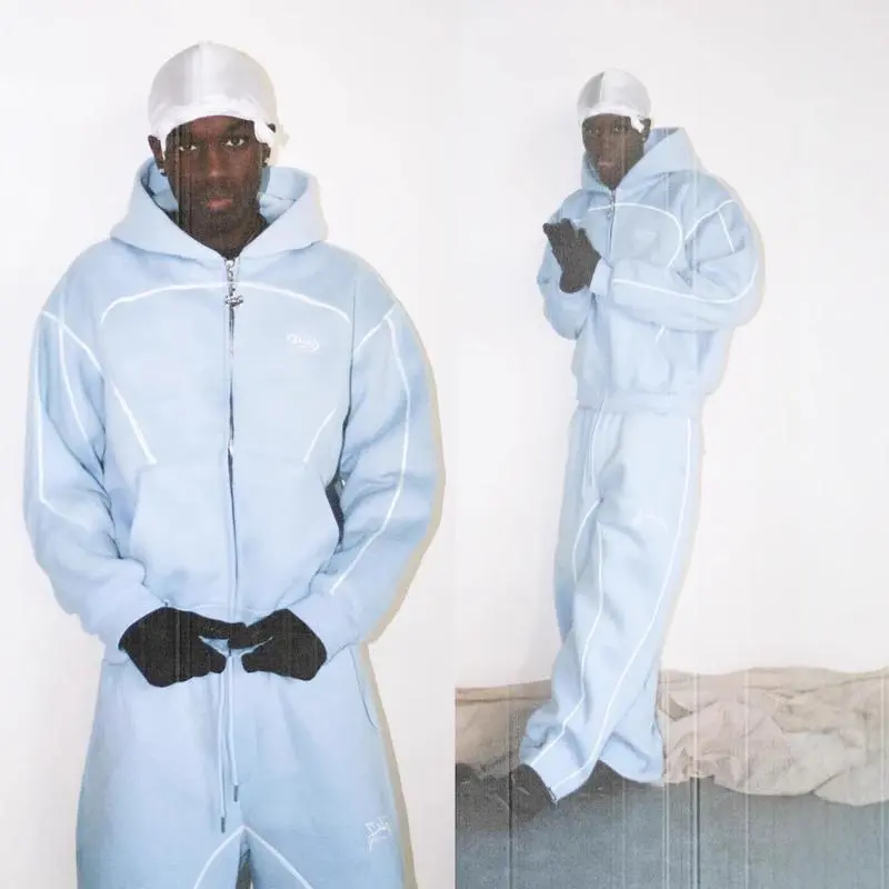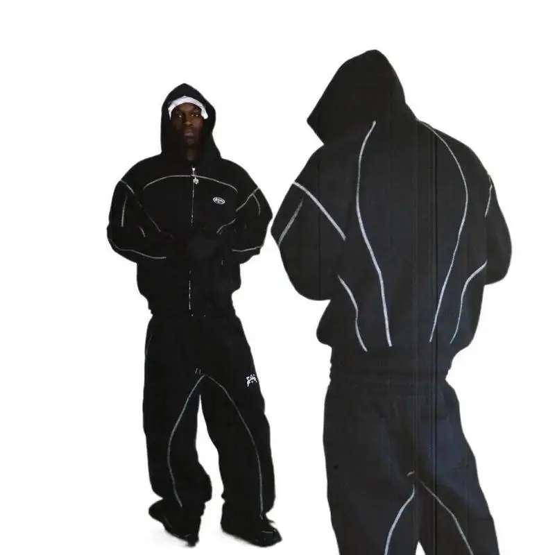 # Hip-Hop Street Style Zipper Hooded Sports Suit, Casual Fashion New Trend Enter, this hip-hop street style zipper hooded sports suit that combines fashion and comfort is making a grand debut, instantly becoming a favorite among those who pursue individuality and trendinessThe hoodie part of the set adopts a loose fit with a casual and drop shoulder design that subtly weakens shoulder lines, creating a laid-back and uninhibited atmosphere. It's also extremely friendly to all body types, whether slim or slightly plump, can be easily worn comfortably. The hooded design with adjustable drawstring is not only but also effectively wards off the chill when it's windy, adding a casual street style to the overall look. The hip-hop elements printed on the chest, cuffs, or back are eye-catching and striking, whether it's bold letters or graffiti patterns that showcase the wearer's trendy attitudeThe pants are also loose-cut, with a straight or slightly flared shape that flatters the leg shape, making the legs appear straighter and longer. The pants hem lifts slightly when walking, giving a chic and casual look. The pants have multiple pocket designs that are both and add a sense of layering. Metal zippers and rivets further enhance the street style coolnessIn terms of material, it uses high-quality cotton blend fabric that is soft and skin-friendly with excellent breathability. It's comfortable to wear in all seasons without being stuffy in summer or too warm in spring and autumn. Whether for daily outings, sports and fitness, or attending trendy gatherings, this sports suit can easily make you the center of attention, showcasing the in-style hip-hop street fashion in