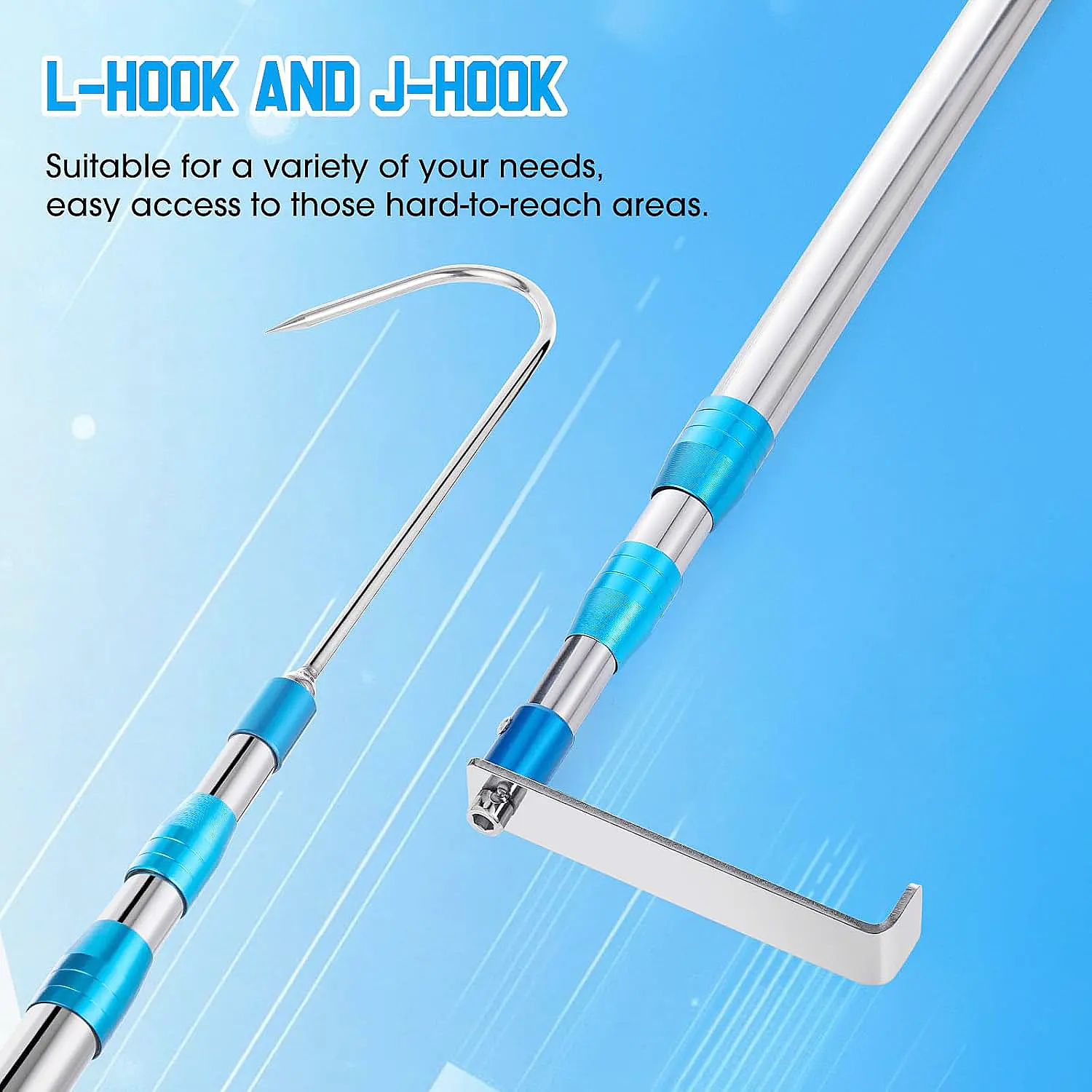 Crafted from stainless steel, the pole and hooks are rust-proof and corrosion-resistant. It can handle over 100 lbs, ensuring reliability and longevity. The 1.1-inch diameter pole and non-slip rubber handle provide a secure grip, enhancing safety and comfort.