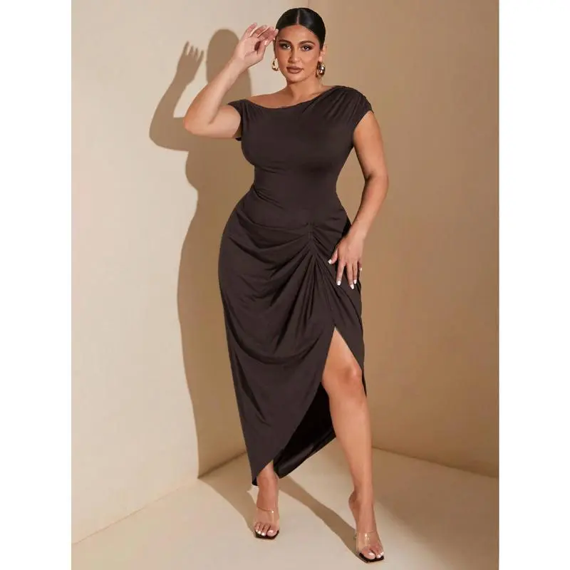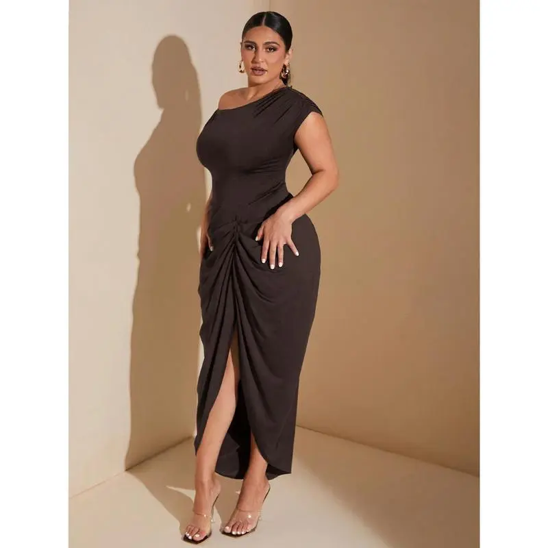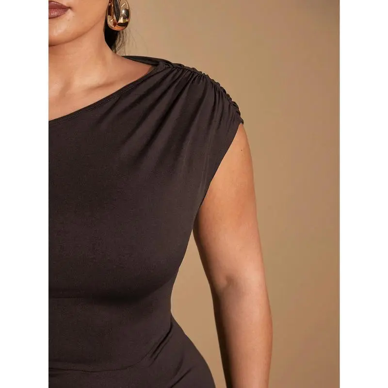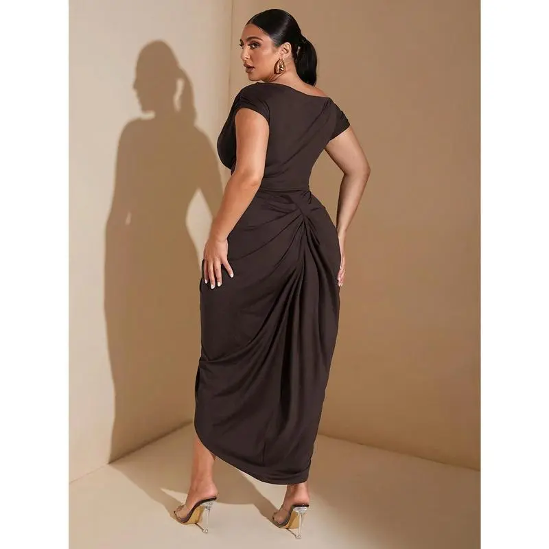 BAE Plus Size Women's Autumn And Winter Fashion Big Women Elegant Date Party Black Stretch Knit Comfort Gathered Details Off-Shoulder Draped Dress Asymmetric Hem Slit Midi Dress Fit Formal Sleeve Womenswear Brown Fabric Workwear Minimalist Sleeveless