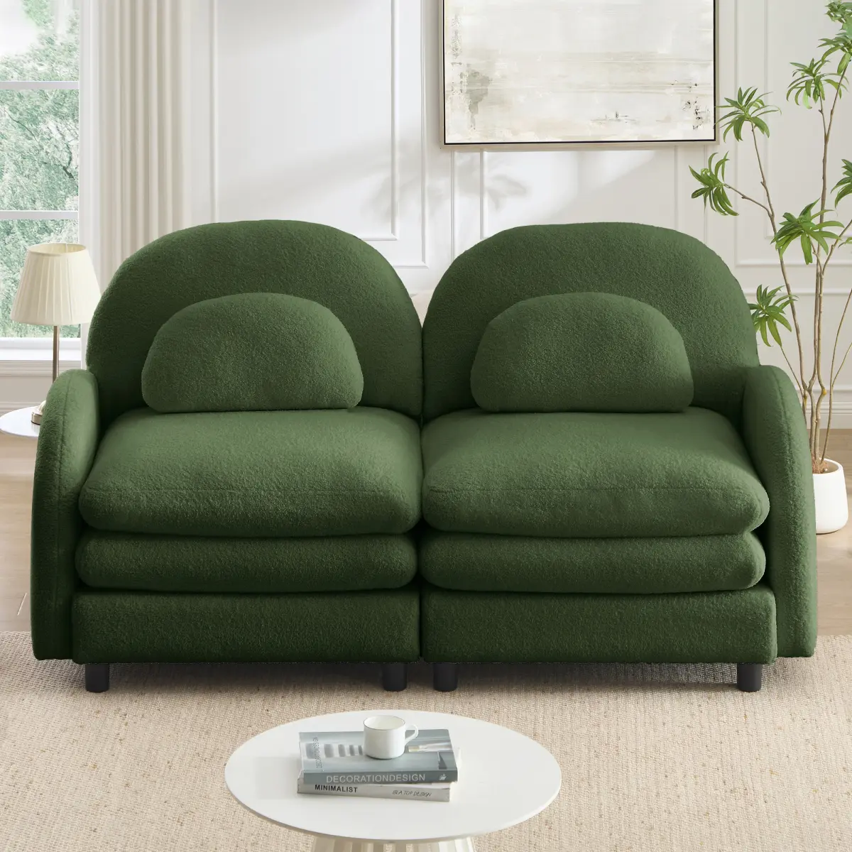 Premium Teddy Fleece Fabric - Selected high-quality teddy fleece fabric is soft and skin‑friendly,with fluffy and rich texture.The fine, short,and even fleece resists shedding and sticking,making it easy to clean and maintain for daily use,combining comfort and practicality. Soft yet supportive - This sofa features a double-layer cushion design. The top layer is soft, elastic and skin-friendly, providing a cloud-like wrapping; the bottom layer offers firm support to effectively distribute body pressure, balancing softness and support for a more layered sitting experience. In addition, it includes both throw pillows and lumbar pillows that double your cozy and comfort, adapting relaxation to any post for all-day.Delicate and Elegant Design - The curved edges Delicate and Elegant Design - The curved edges of the backrest and armrests deliver an elegant aesthetic. Paired with vintage color options, it enhances your living room with strong artistic atmosphere and refined elegance, upgrading the overall beauty of your space. Flexible Modular Combination - Different from fixed layouts,each component of this sofa set is designed as an independent unit,allowing for easy movement and rearrangement to suit various room layouts.Suitable for multiple scenarios. Easy Assembly & Enhanced Stability - The sofa modules adopt precision screw connectors for easy assembly and disassembly, and can be repeatedly installed.The connection is firm and secure without loosening or gaps, ensuring a smooth appearance and solid texture. It remains stable and durable even after longterm use.