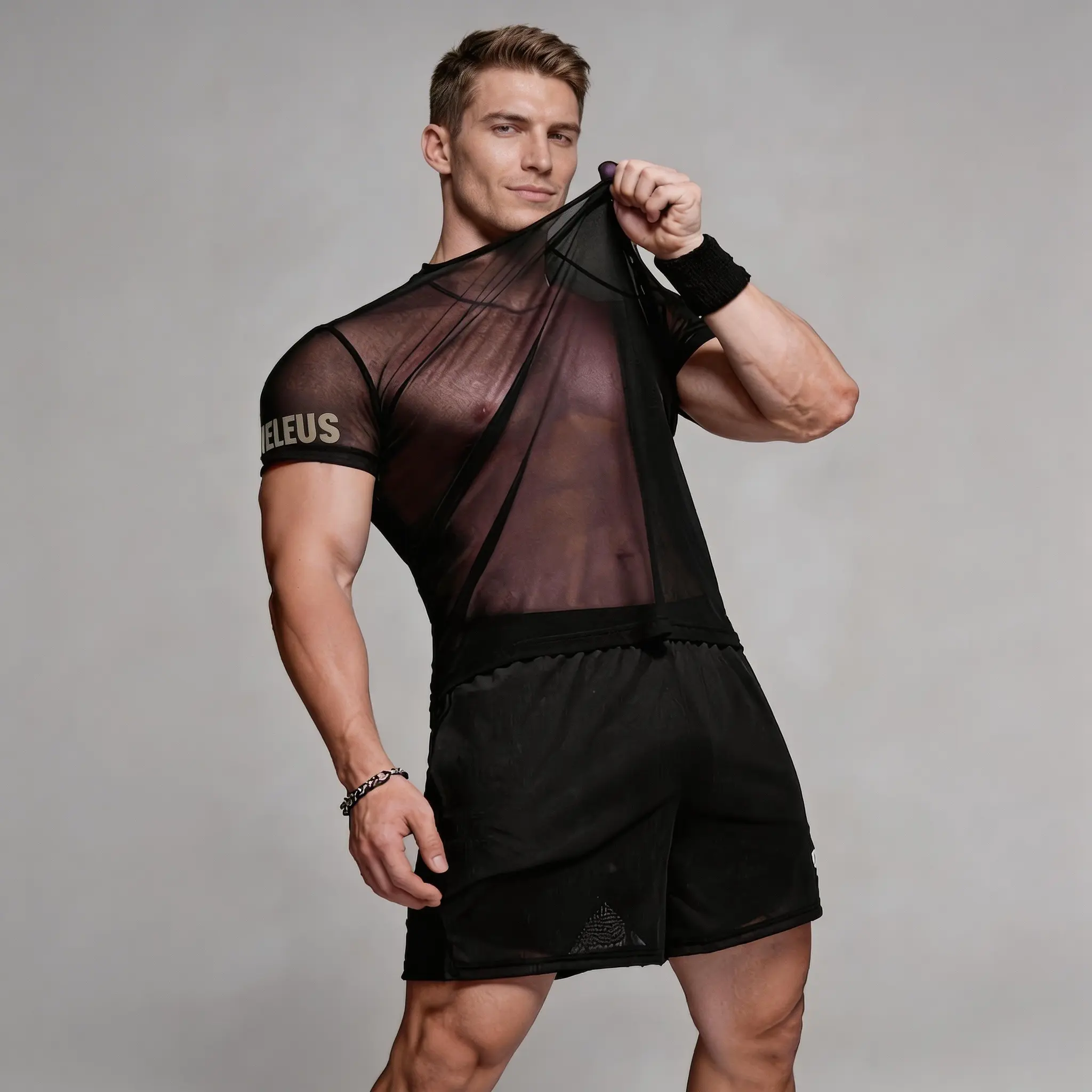 2. Sheer Black Mesh + Loose Fit – Shows Muscle & Defines Physique